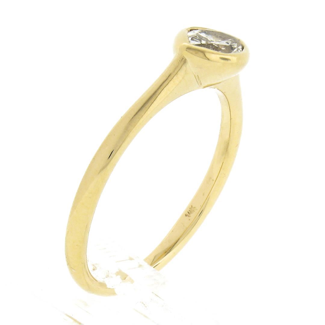 A new solid 14k yellow gold solitaire ring, with 1 marquise cut natural diamond (K - I1 ; 0.53ct). The ring is size 6.5, weighs a total of 2.33 grams, and measures 5.5mm wide.