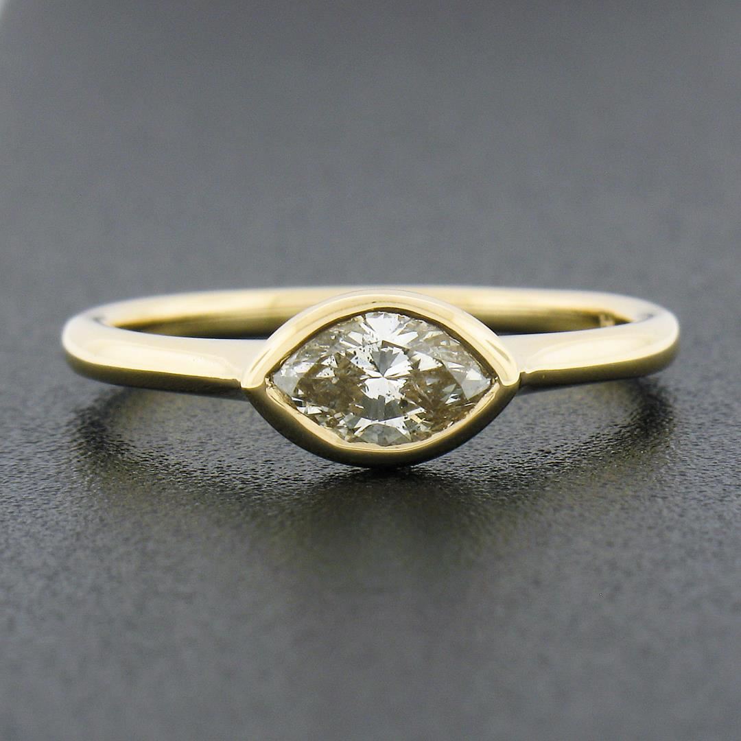 A new solid 14k yellow gold solitaire ring, with 1 marquise cut natural diamond (K - I1 ; 0.53ct). The ring is size 6.5, weighs a total of 2.33 grams, and measures 5.5mm wide.