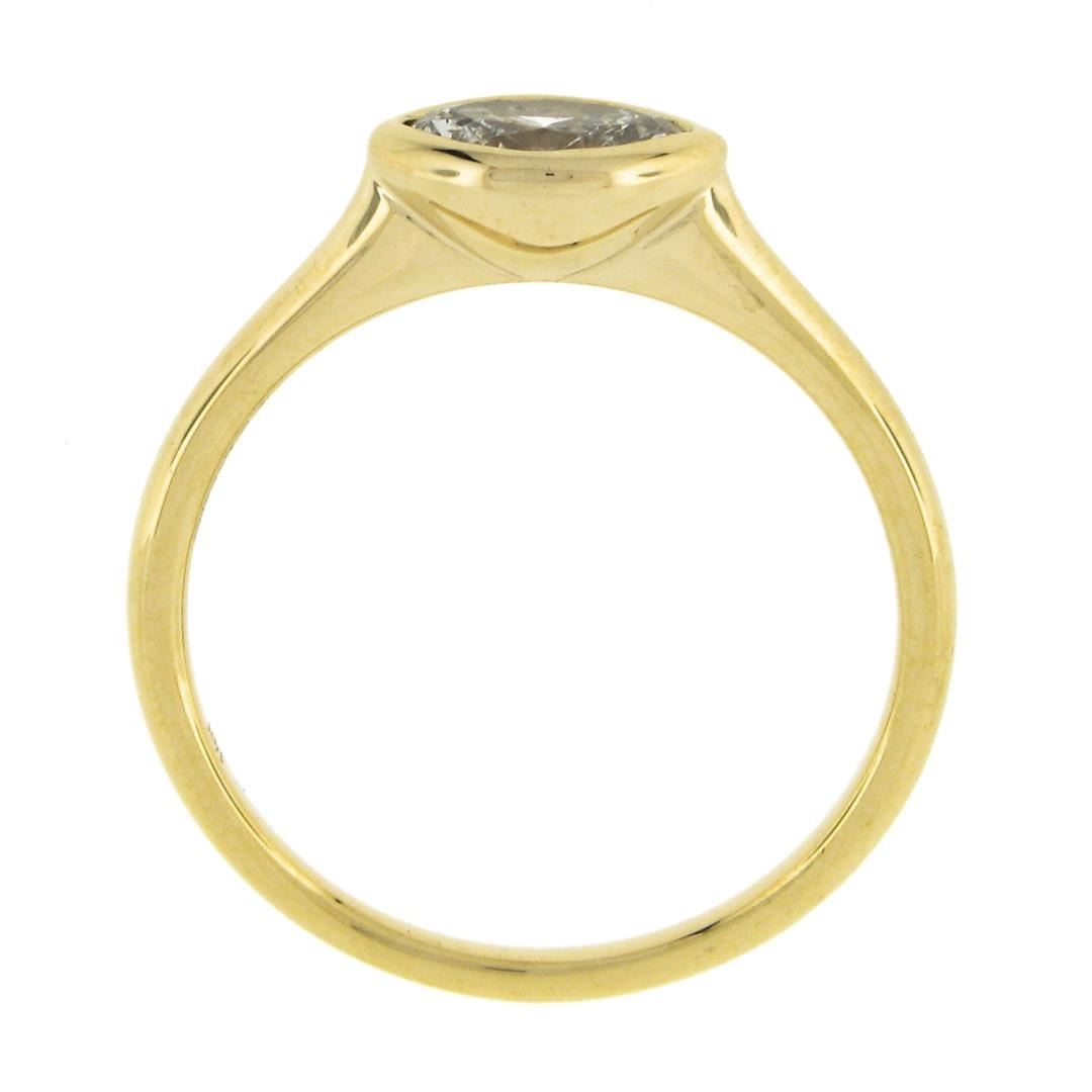 A new solid 14k yellow gold solitaire ring, with 1 marquise cut natural diamond (K - I1 ; 0.53ct). The ring is size 6.5, weighs a total of 2.33 grams, and measures 5.5mm wide.