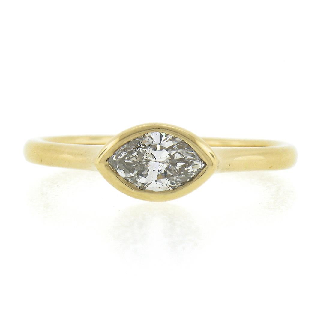 A new solid 14k yellow gold solitaire ring, with 1 marquise cut natural diamond (K - I1 ; 0.53ct). The ring is size 6.5, weighs a total of 2.33 grams, and measures 5.5mm wide.