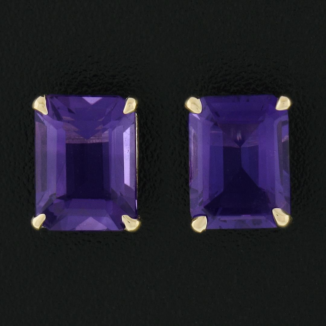 a new solid 14k yellow gold stud earrings, with 2 emerald cut natural amethysts (2.64ctw). The earrings measure approximately 8x6.5mm and weigh a total of 1.44 grams.