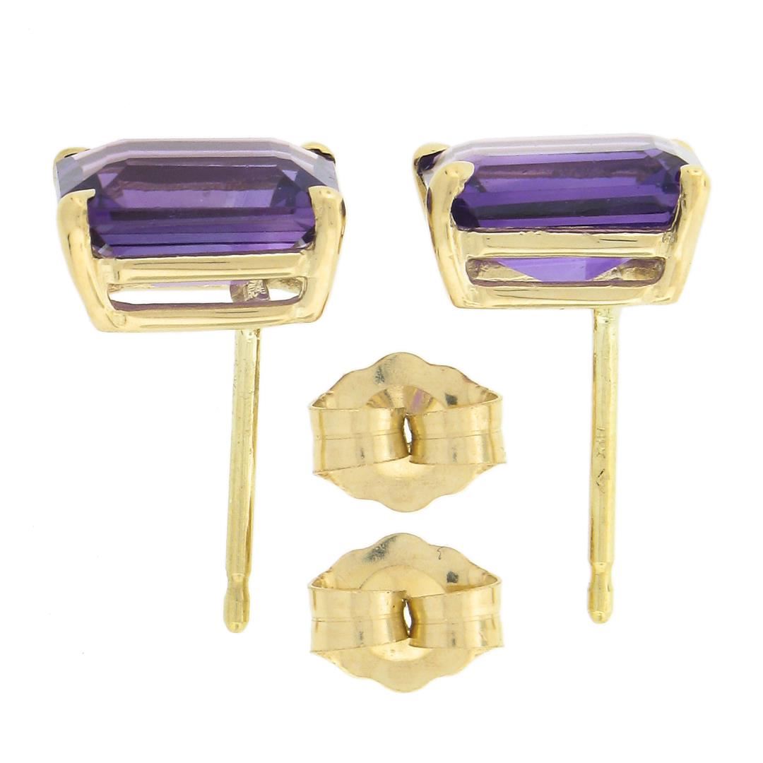 a new solid 14k yellow gold stud earrings, with 2 emerald cut natural amethysts (2.64ctw). The earrings measure approximately 8x6.5mm and weigh a total of 1.44 grams.
