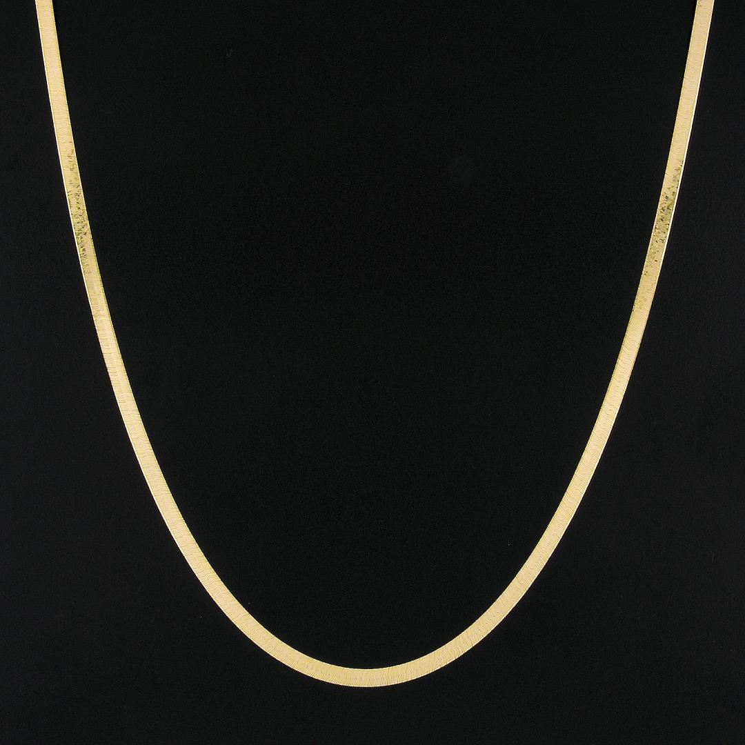 A new solid 14k yellow gold flat herringbone link necklace. It weighs a total of 6.30 grams, measures 4mm wide, and measures 18 inches in length.