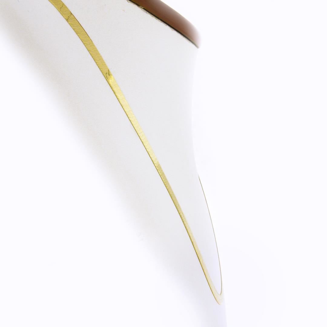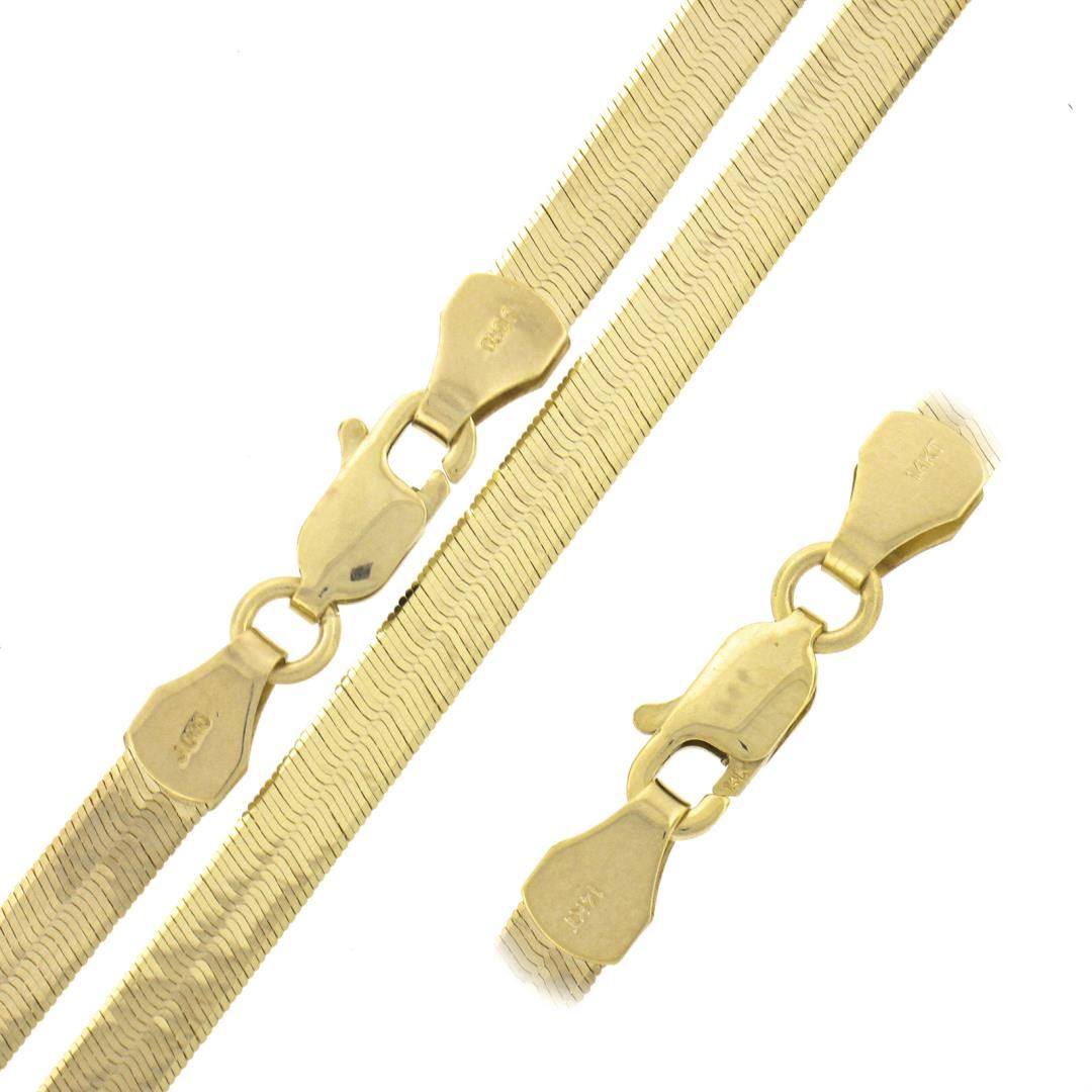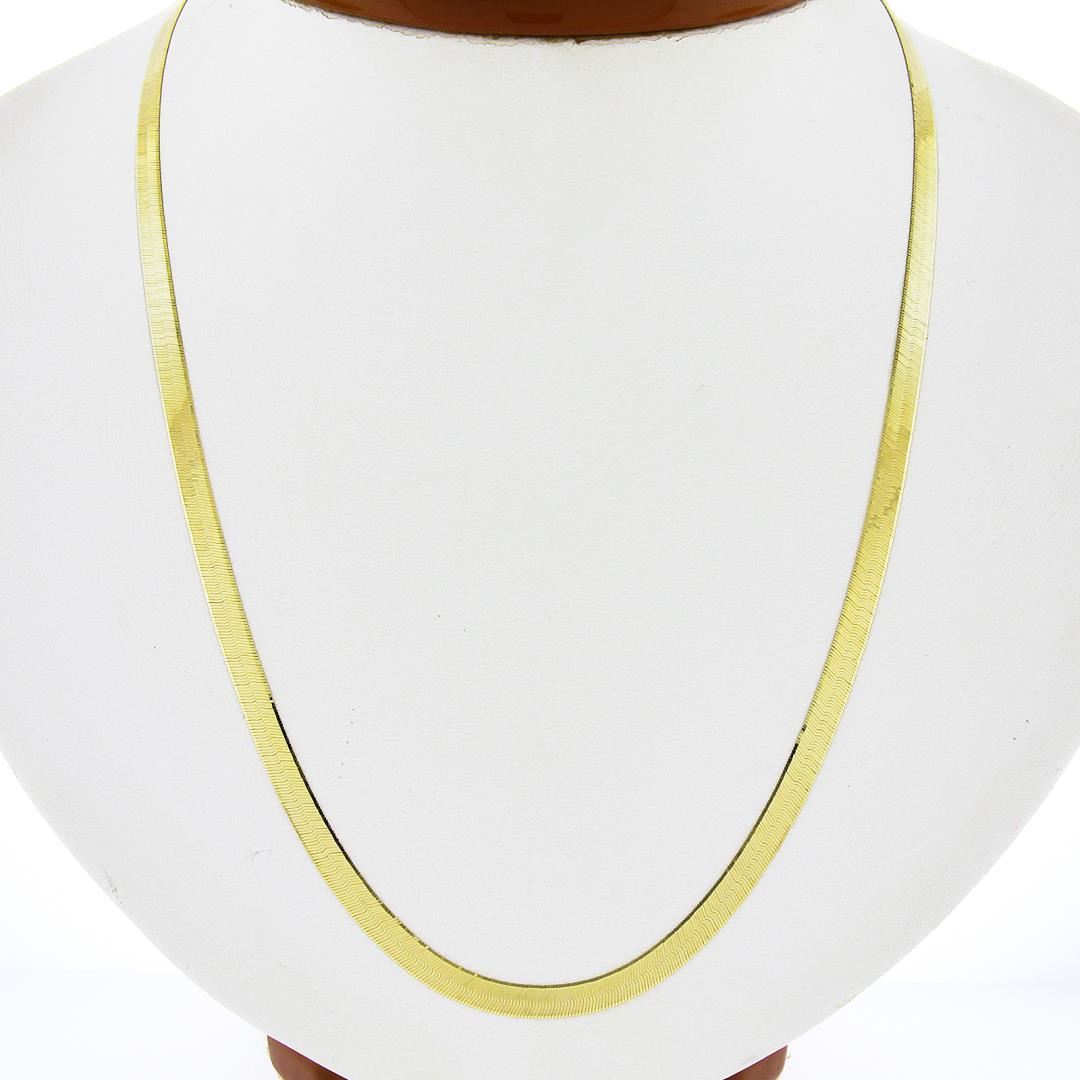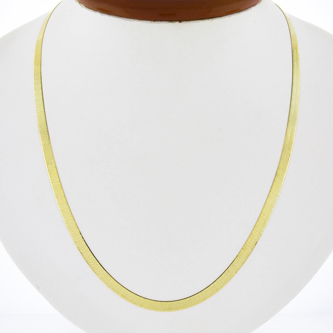 A new solid 14k yellow gold flat herringbone link necklace. It weighs a total of 6.30 grams, measures 4mm wide, and measures 18 inches in length.