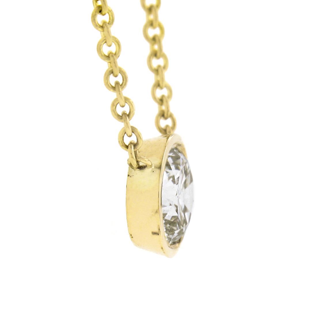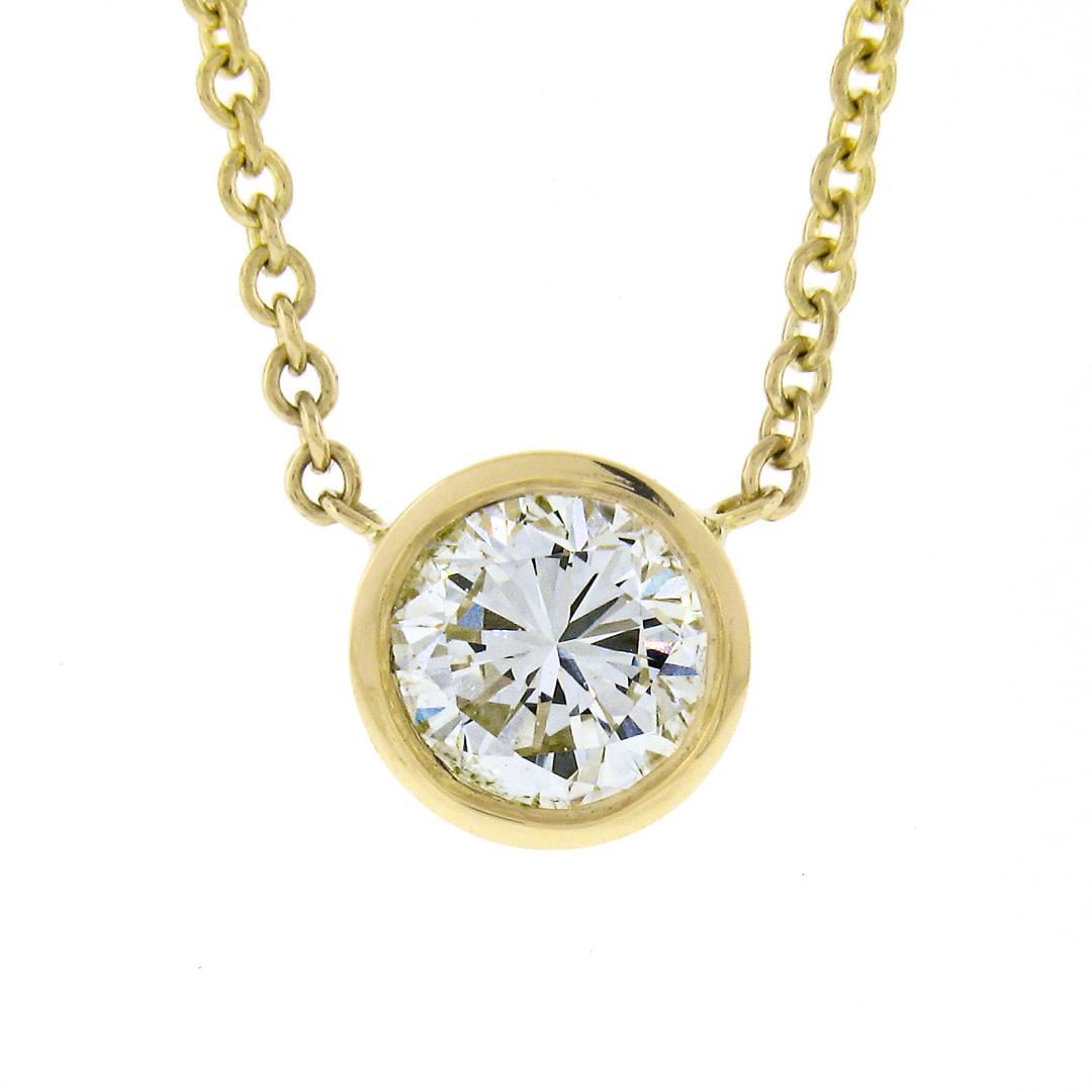 A new solid 14k yellow gold solitaire pendant neckalce, featuring 1 round brilliant cut natural diamond (J - VS2 ; 0.60ct). adjustable at 16 or 18 Inches cable link chain, 2.73 grams total weight, pendant measures 6.7mm in diameter.