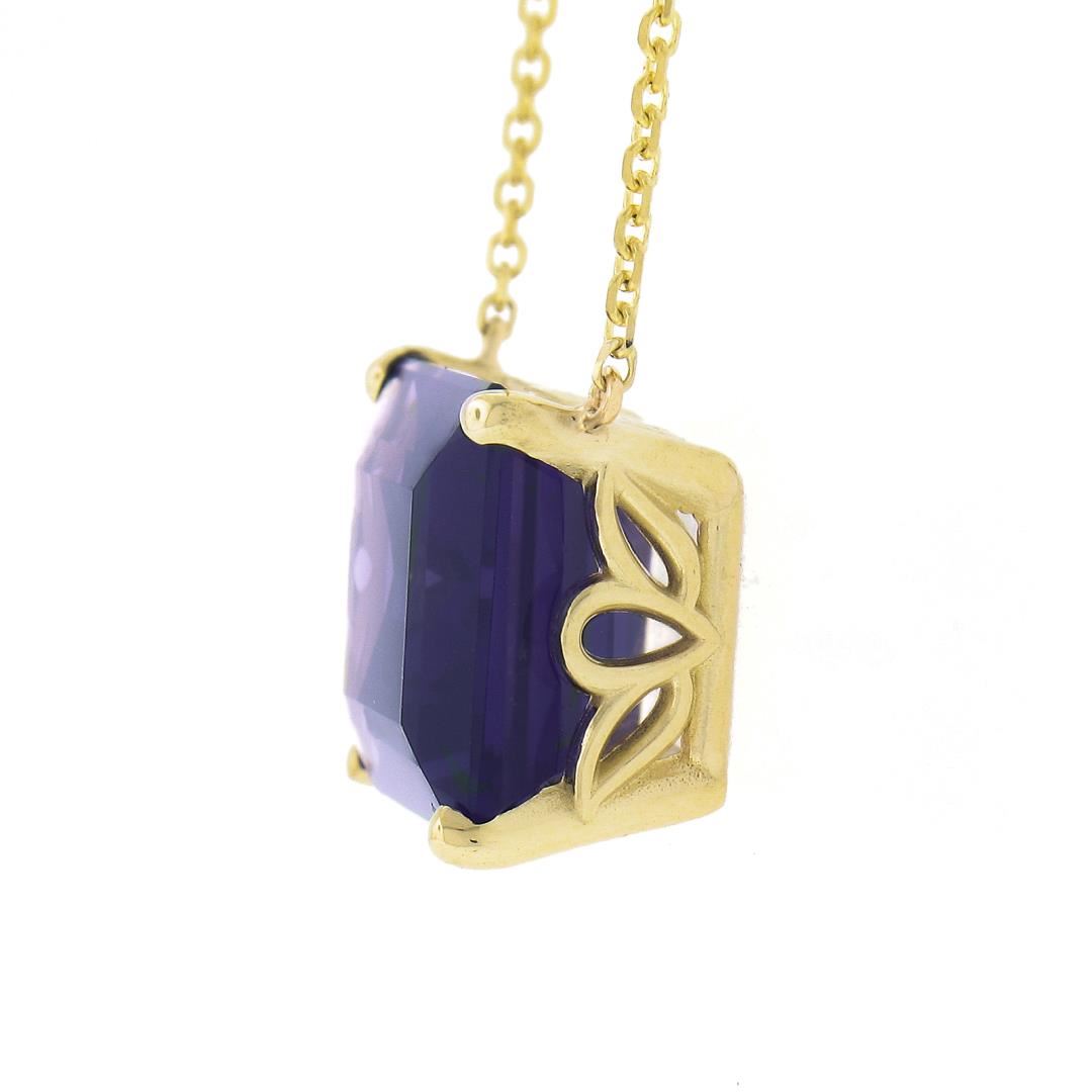 A new solid 14k yellow gold pendant necklace, with 1 emerald cut natural amethyst (14.6x11.4mm). 18.5 inch cable link chain, 5.10 grams total weight, pendant measures 11.8x15.9mm.