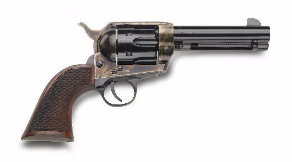 These 1873 revolvers are truly shooting works of art! Our transfer bar safety system provides the highest level of safety offered in an 1873 single action firearm. All models have steel frames and are authentic reproductions. This model is .45 LC, has a checkered walnut grip, and has a 5.5" Color-Case hardened finish. This is a 6-shot revolver.