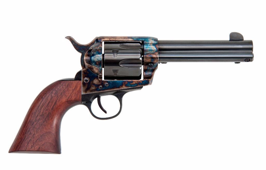 These 1873 revolvers are truly shooting works of art! Our transfer bar safety system provides the highest level of safety offered in an 1873 single action firearm. All models have steel frames and are authentic reproductions. This model is .45 LC, has a walnut grip, and has a 4.75" Color-Case hardened finish. This is a 6-shot revolver.