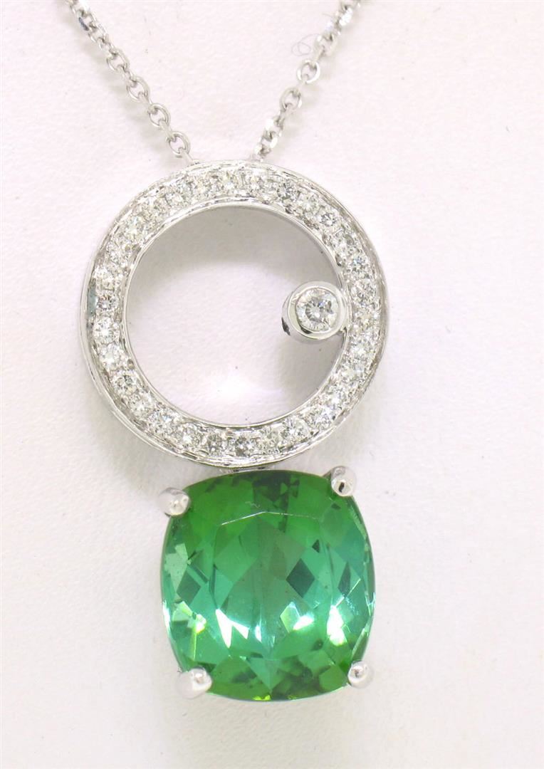 A new solid 18k white gold pendant necklace, featuring 1 cushion brilliant cut natural tourmaline (10.1x10.9mm - 3.50ct), and 27 round brilliant cut natural diamonds (F- VS2 ; 0.35ctw). The pendant weighs a total of 7.10 grams, measures 26.1x14.7mm including the bail, and 18 inch cable link chain.