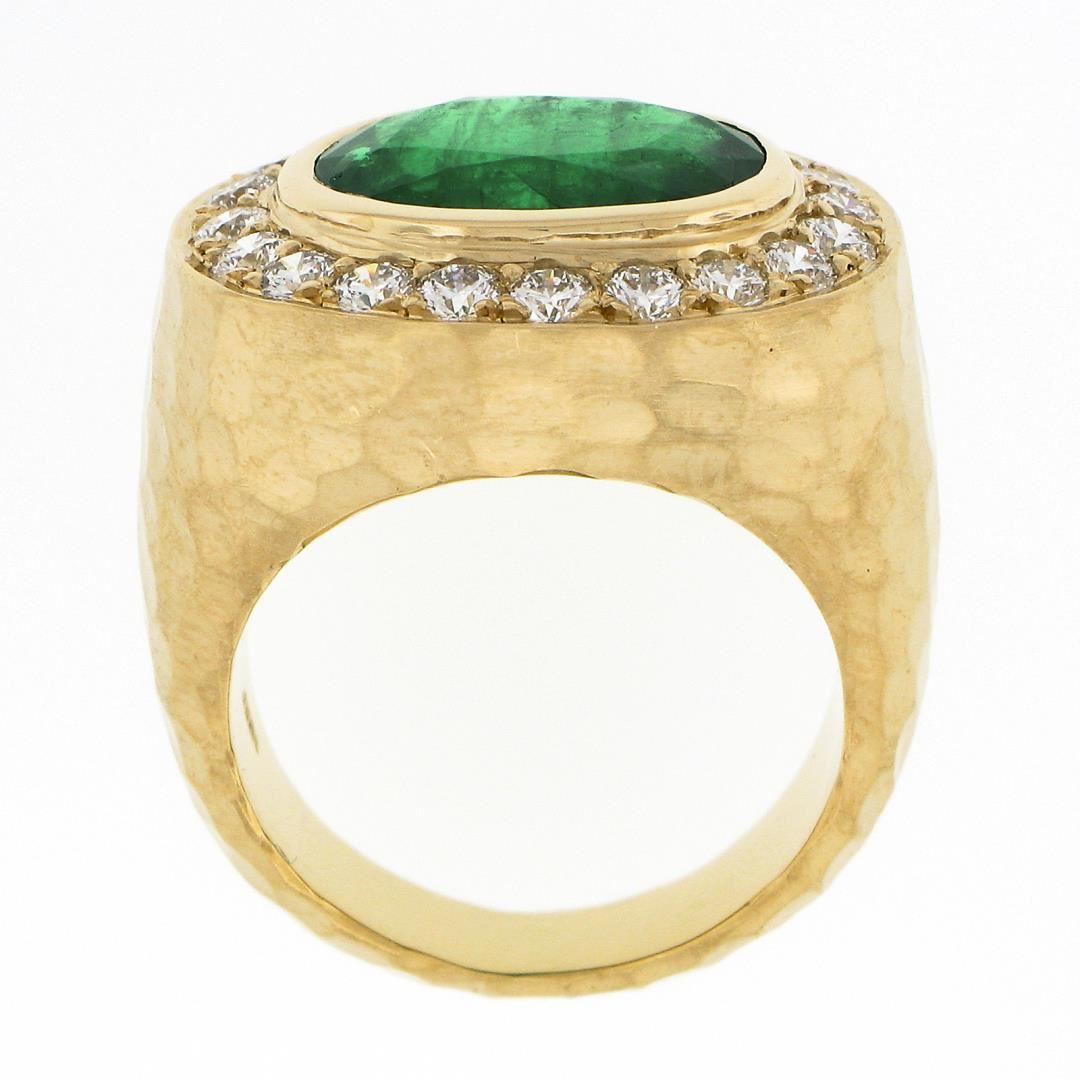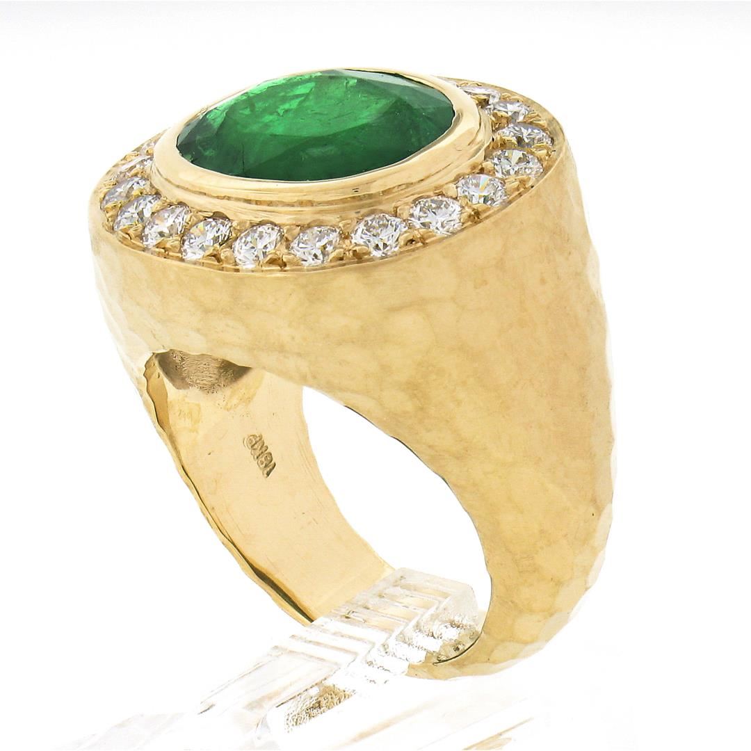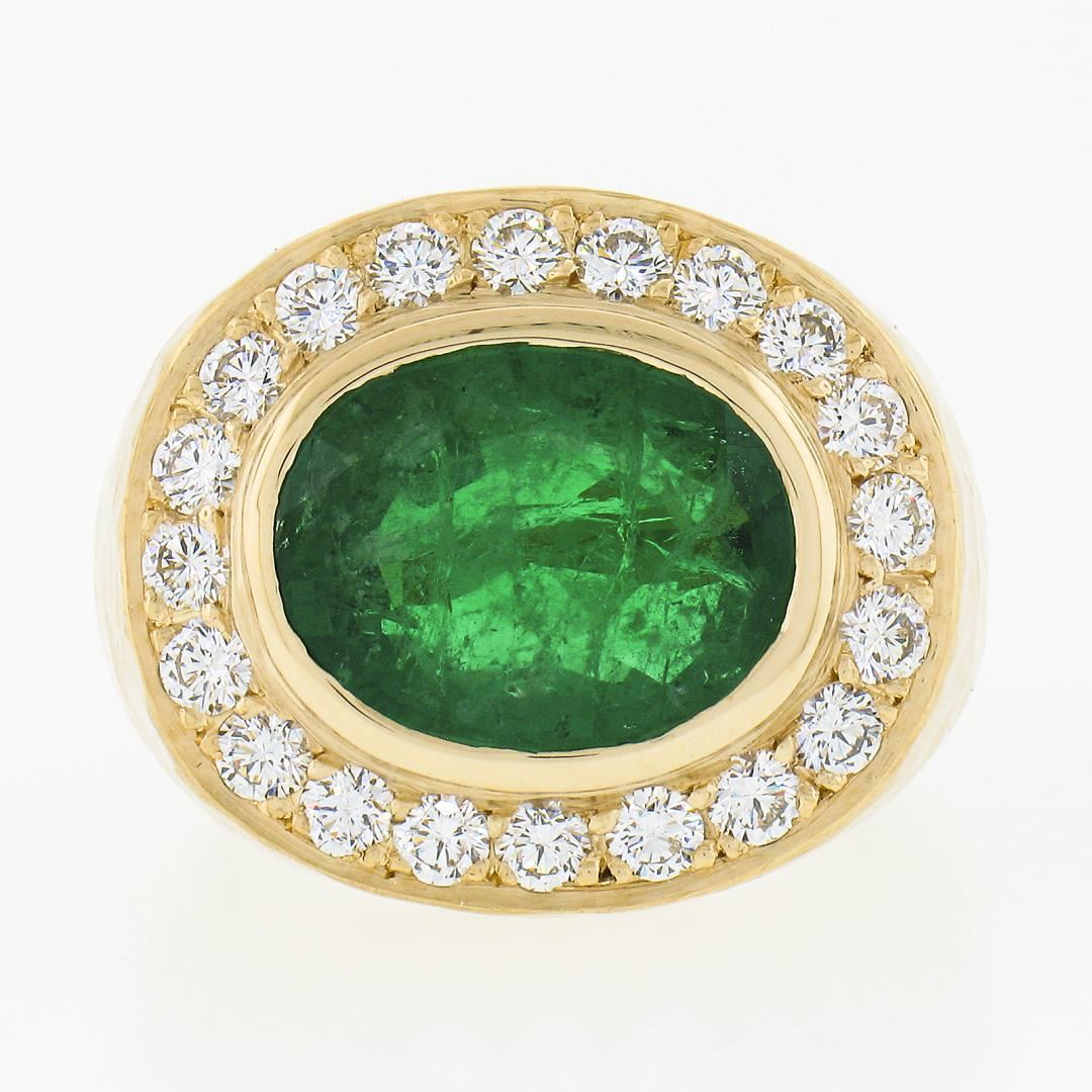 A new solid 18k yellow gold ring, with 1 GIA graded oval emerald (6.55ct ), and 20 round brilliant cut natural diamonds (E/F - VS1/VS2 ; 1.15ctw). The ring is size 6.5, weighs a total of 20.46 grams, and measures 18.2mm wide. Comes with all original relevant certifications.