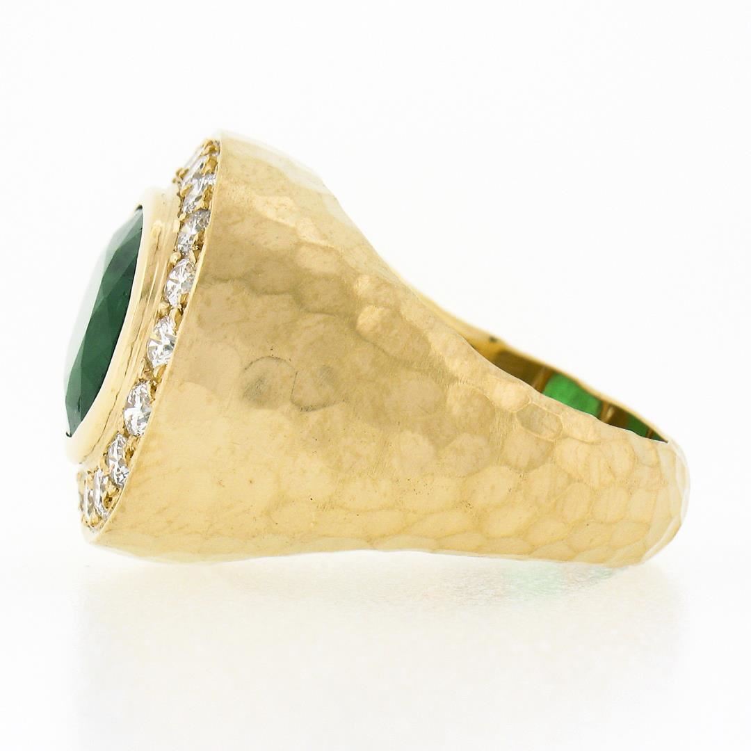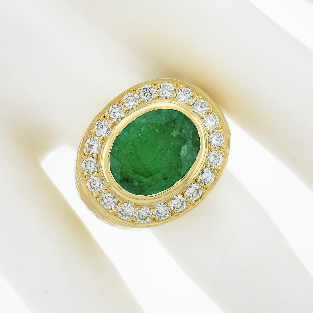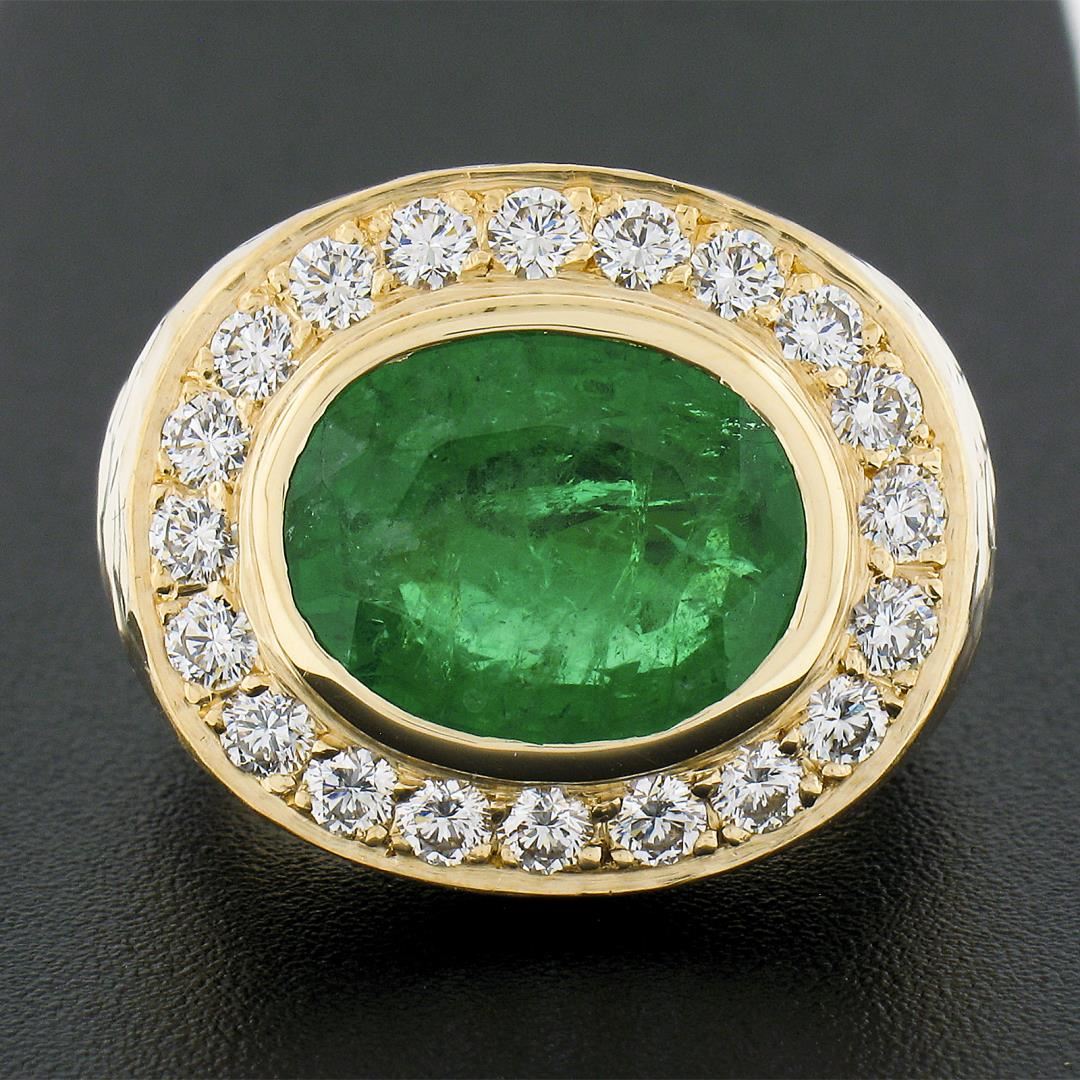 A new solid 18k yellow gold ring, with 1 GIA graded oval emerald (6.55ct ), and 20 round brilliant cut natural diamonds (E/F - VS1/VS2 ; 1.15ctw). The ring is size 6.5, weighs a total of 20.46 grams, and measures 18.2mm wide. Comes with all original relevant certifications.