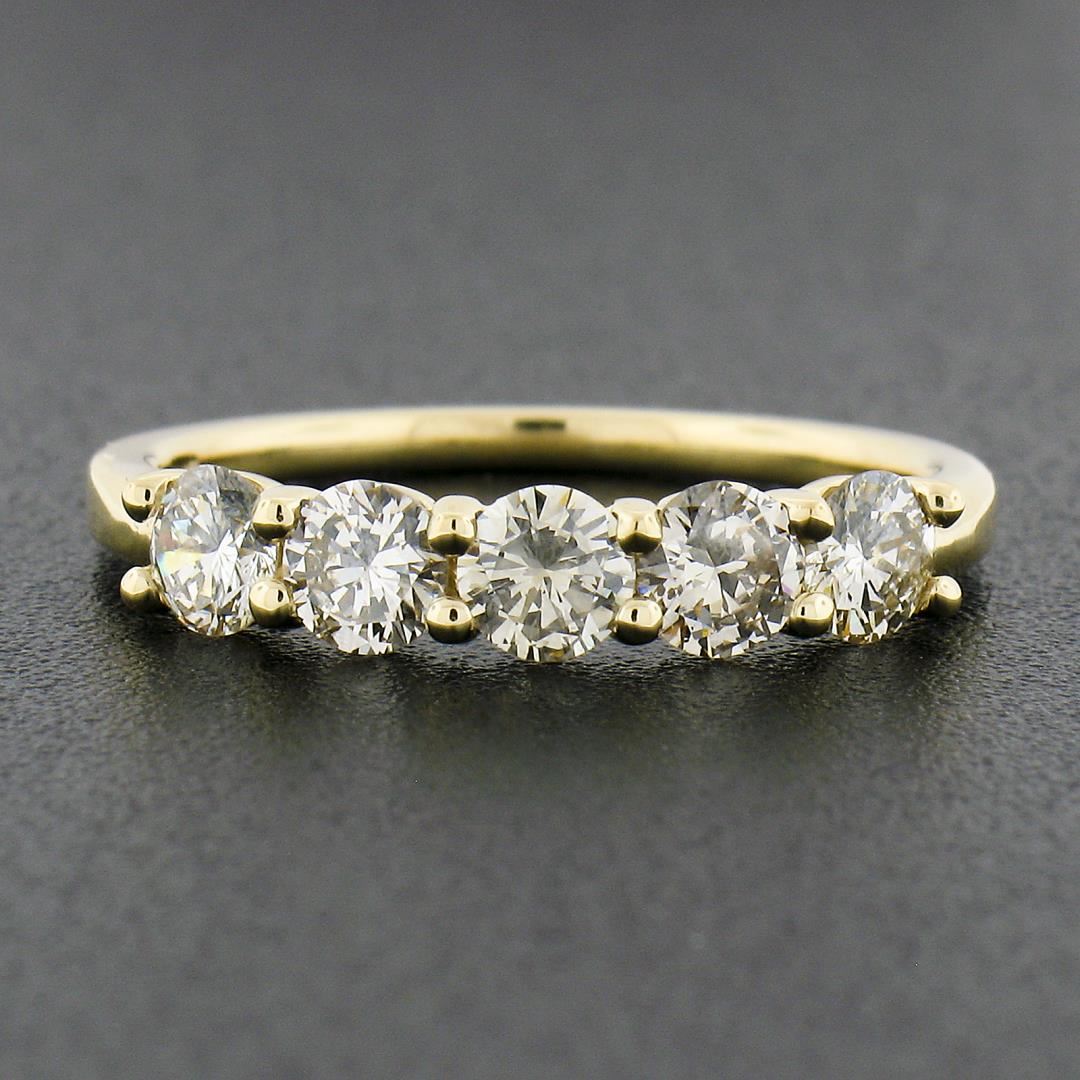 a new solid 18k yellow gold band ring, with 5 round cut natural diamonds (K-L / Light Brown - SI1-SI2 ; 0.92ctw). The ring is size 6.5, weighs a total of 2.75 grams, and measures 3.8mm wide.