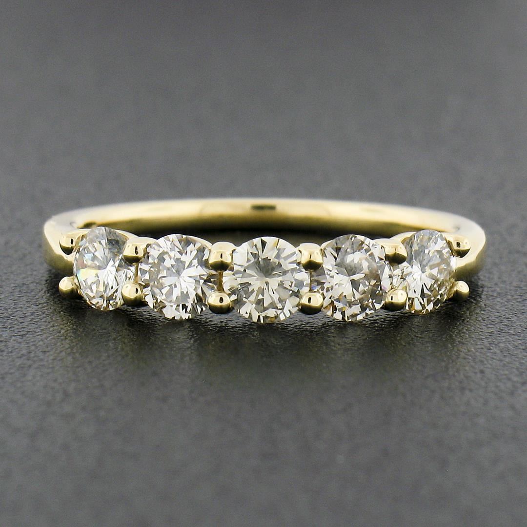 a new solid 18k yellow gold band ring, with 5 round cut natural diamonds (K-L / Light Brown - SI1-SI2 ; 0.92ctw). The ring is size 6.5, weighs a total of 2.75 grams, and measures 3.8mm wide.