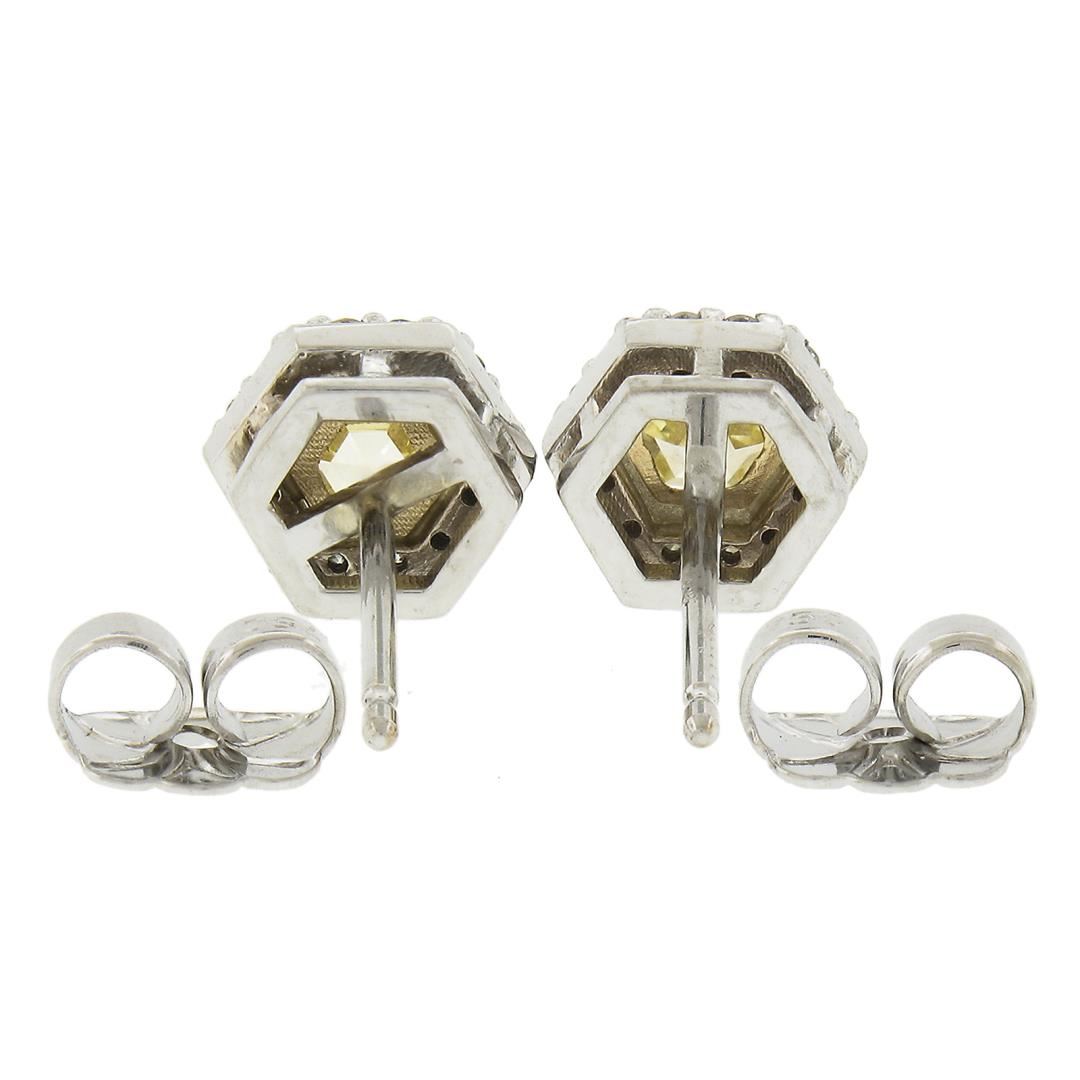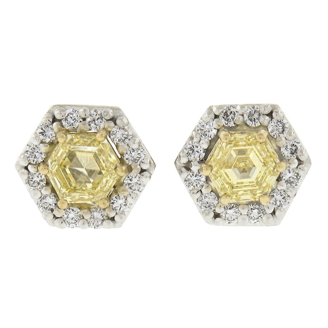 A new solid 14k yellow & white gold earrings , featuring 2 GIA graded hexagonal cut fancy yellow natural diamonds (VVS2 ; 0.59ctw), surrounded with a halo of 24 round cut natural diamonds (F/G Color - VS1/VS2 ; 0.12ctw ). The earrings measure approximately 6.3mm outter diameter and weigh a total of 2.02 grams. Comes with all original relevant certifications.