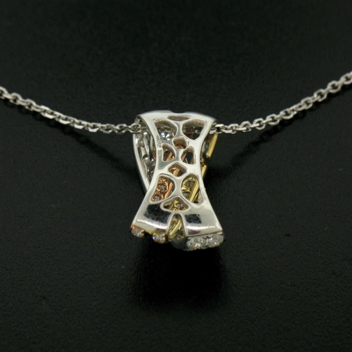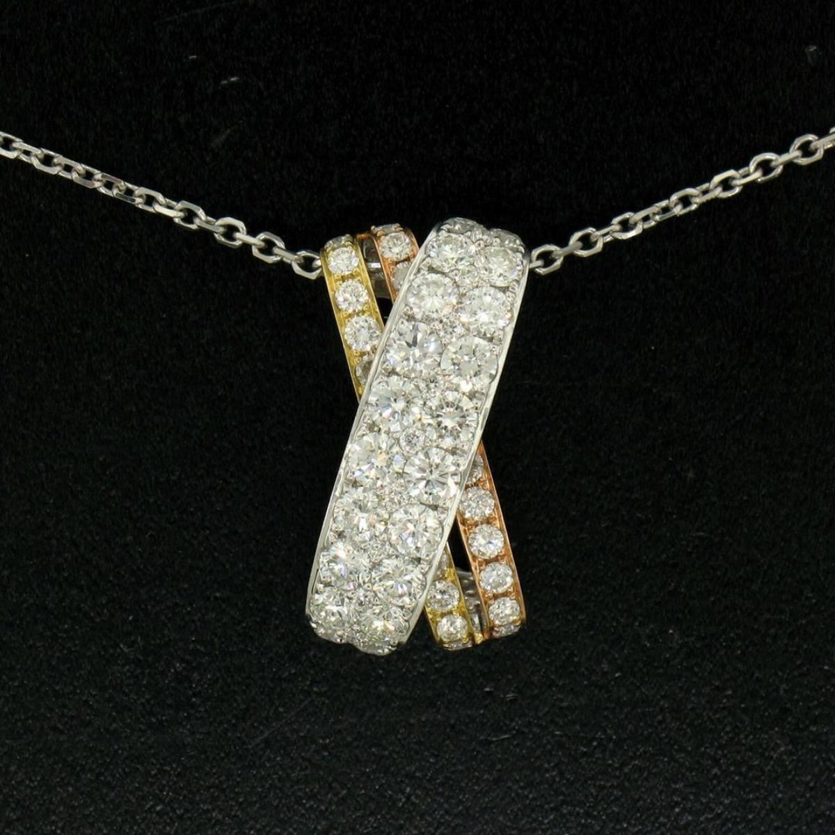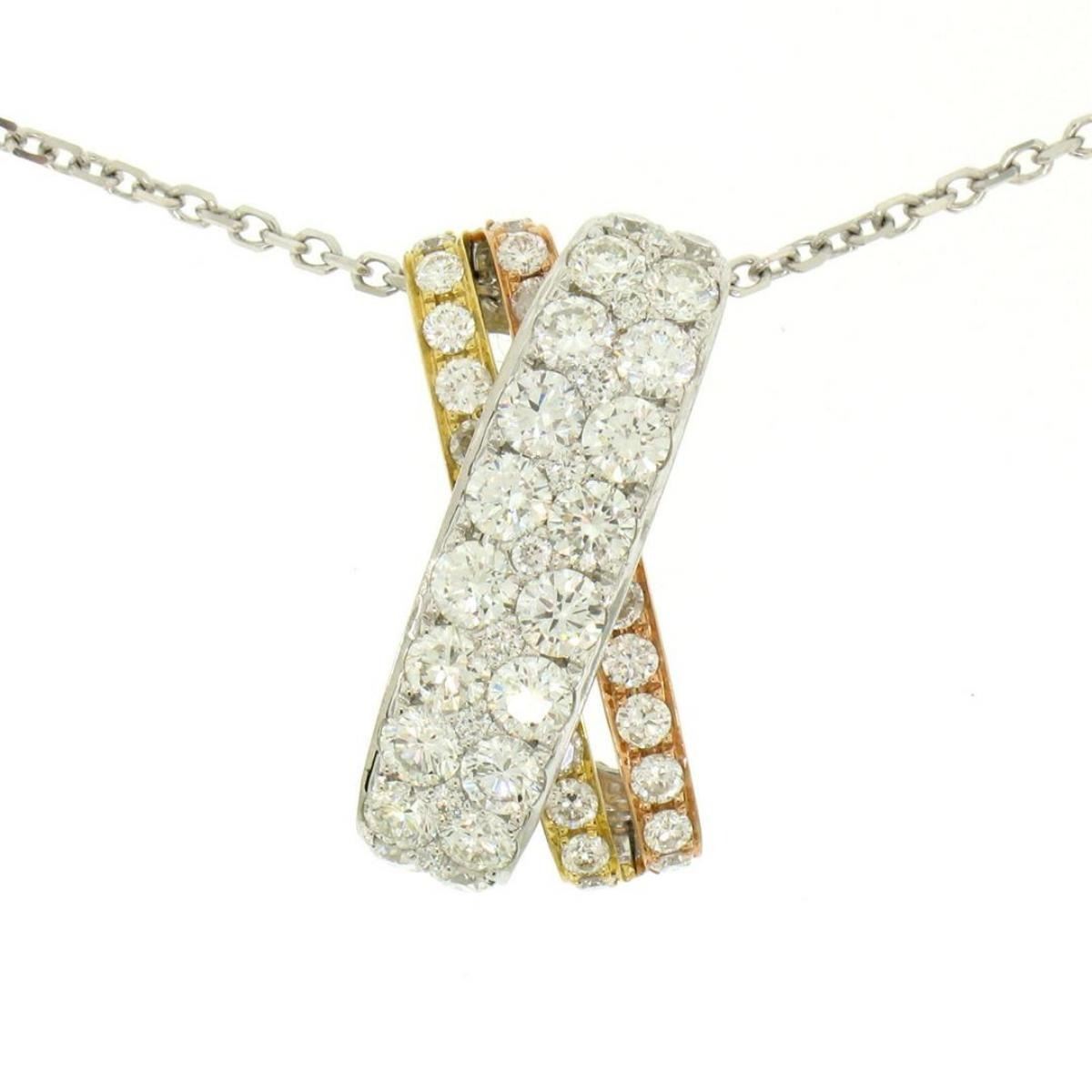 One NEW 18k Tri-Color Gold X Pendant w/ 2.18ctw F VS Pave Round Brilliant Diamonds. Item Details: Material: 18k Solid Gold (Chain is 14k), Weight: 6.3 Grams, Stone(s): (20) Natural Genuine Diamonds - Round Brilliant Cut - Pavé Set - VS2 Clarity - F Color - 2.4mm (avg.), (26) Natural Genuine Diamonds - Round Brilliant Cut - Pavé Set - VS2 Clarity - F Color - 2.0mm (approx.), (9) Natural Genuine Diamonds - Round Brilliant Cut - Pavé Set - VS2 Clarity - F Color - 1.0mm (approx.), Total Carat Weight: 2.18, Chain Type: Diamond Cut Cable Link, Chain Length: 18 Inches Clasp: Lobster Claw Width: 11.02mm Height: 22.51mm Thickness: 8.69mm Condition: New w/o Tag