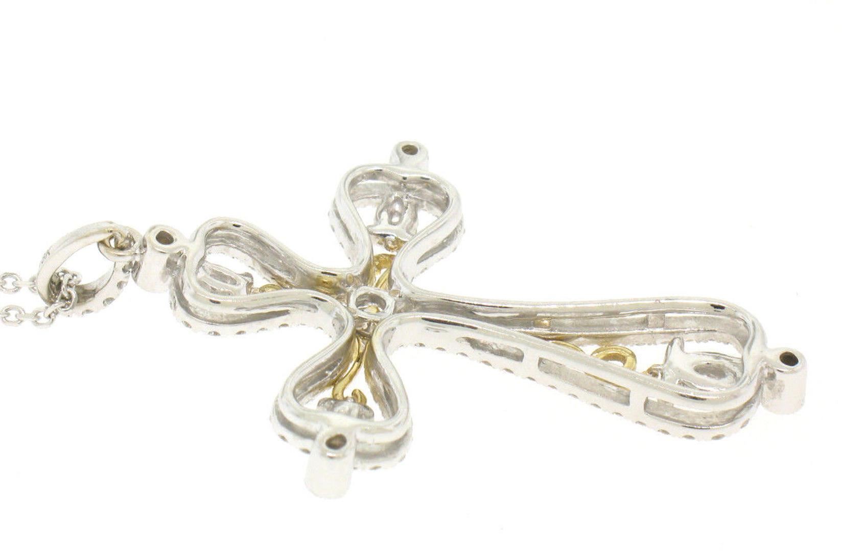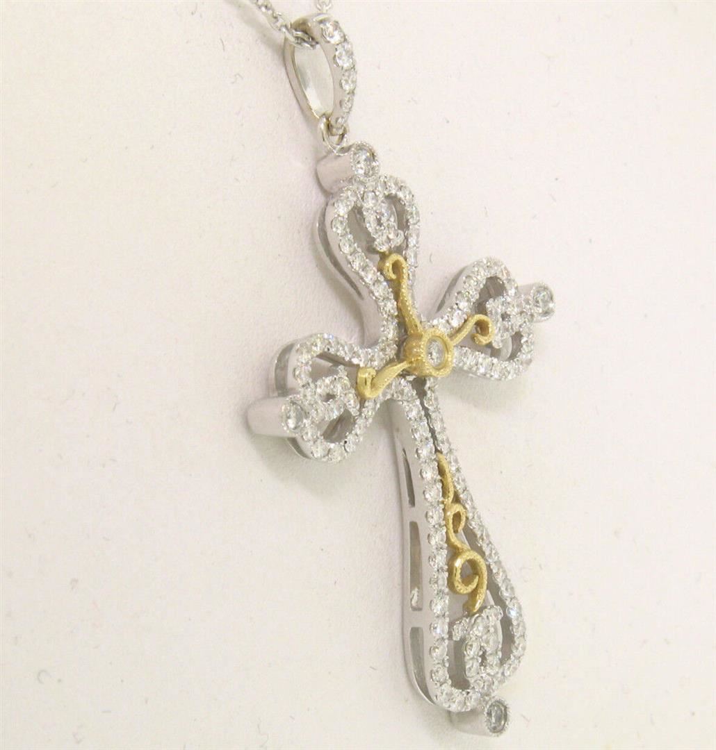 A new solid 18k white and yellow gold cross pendant, featuring ideal round cut natural diamonds (F - VS1/VS2; 1.26ctw). The pendant weighs a total of 7.2 grams, measures 44x#26mm including the bail.