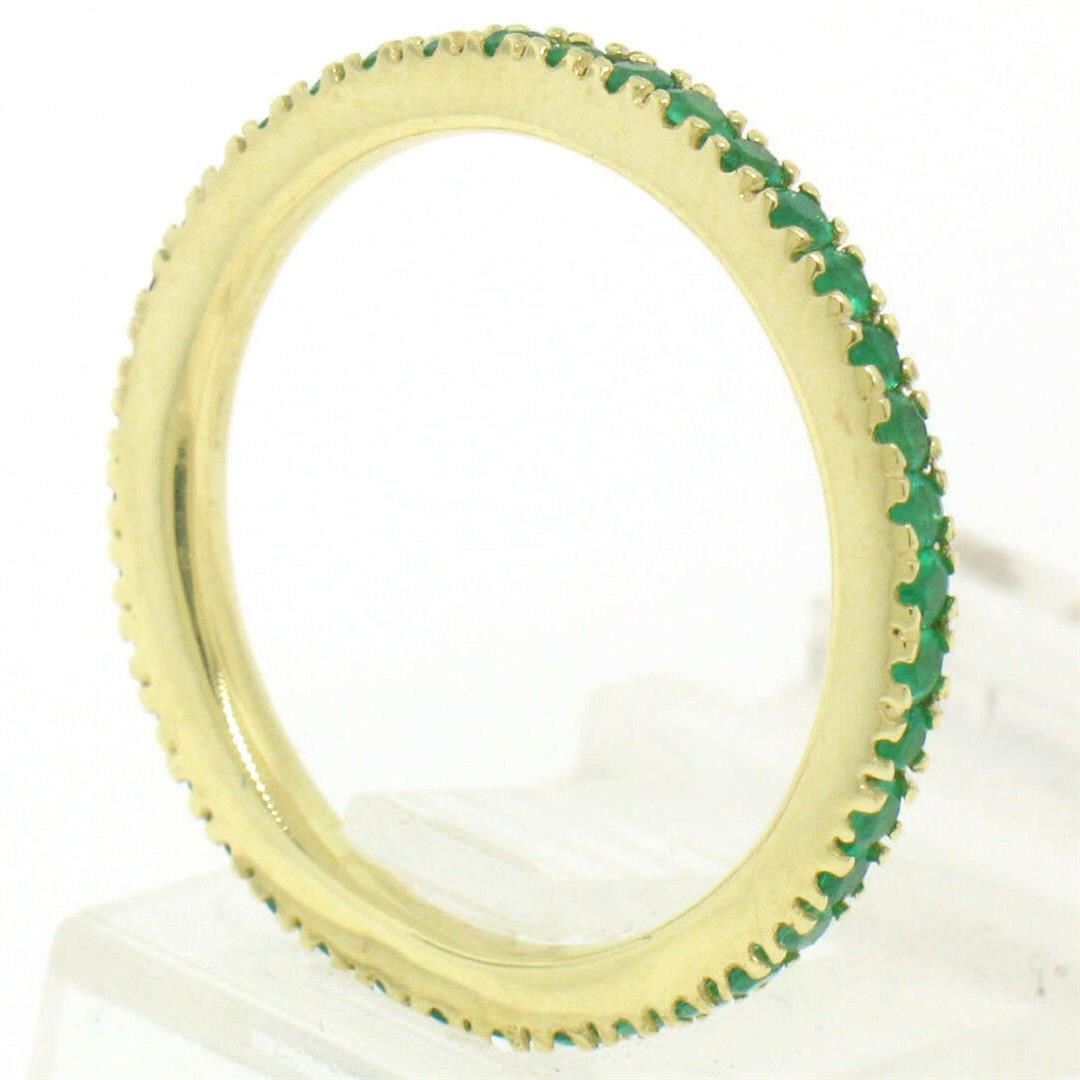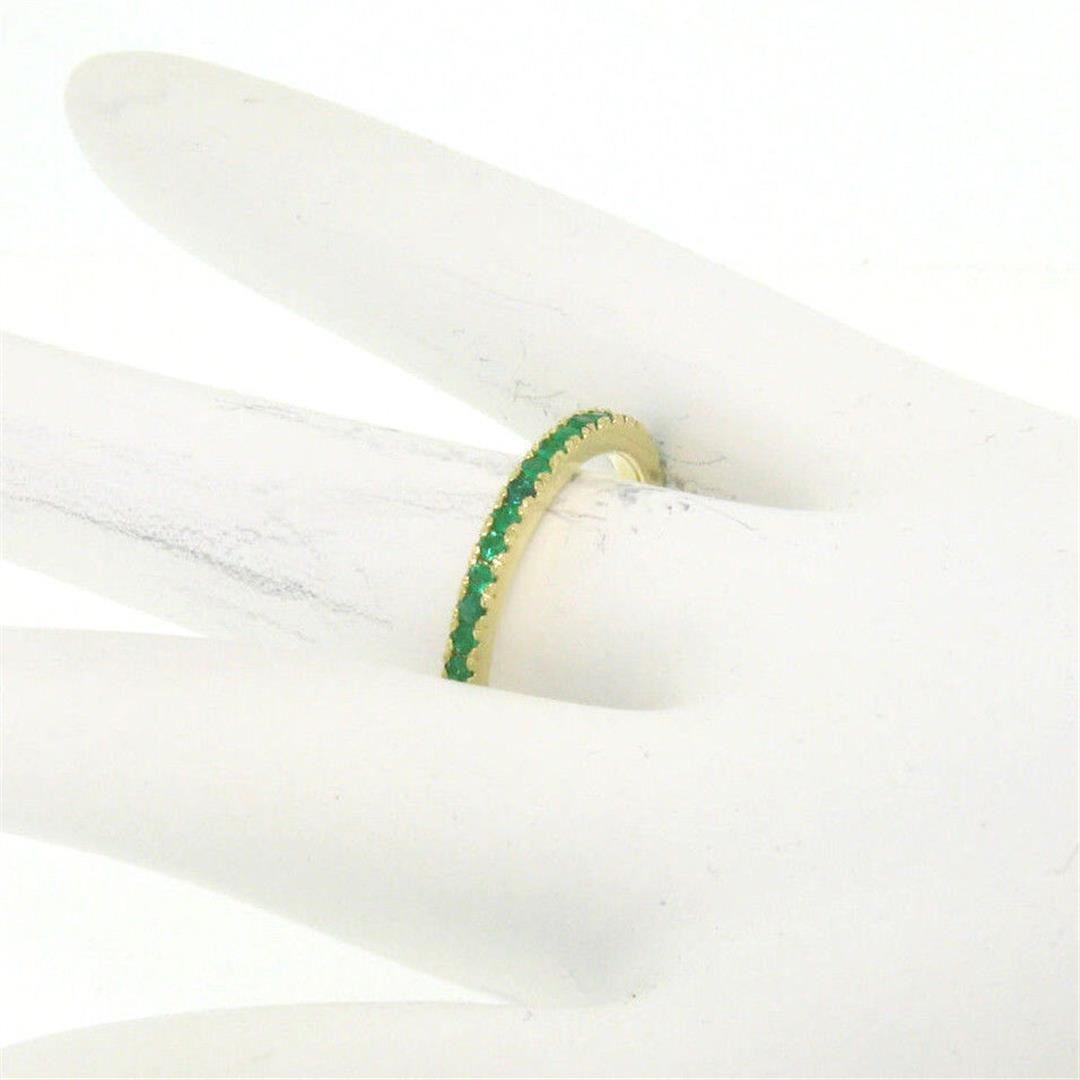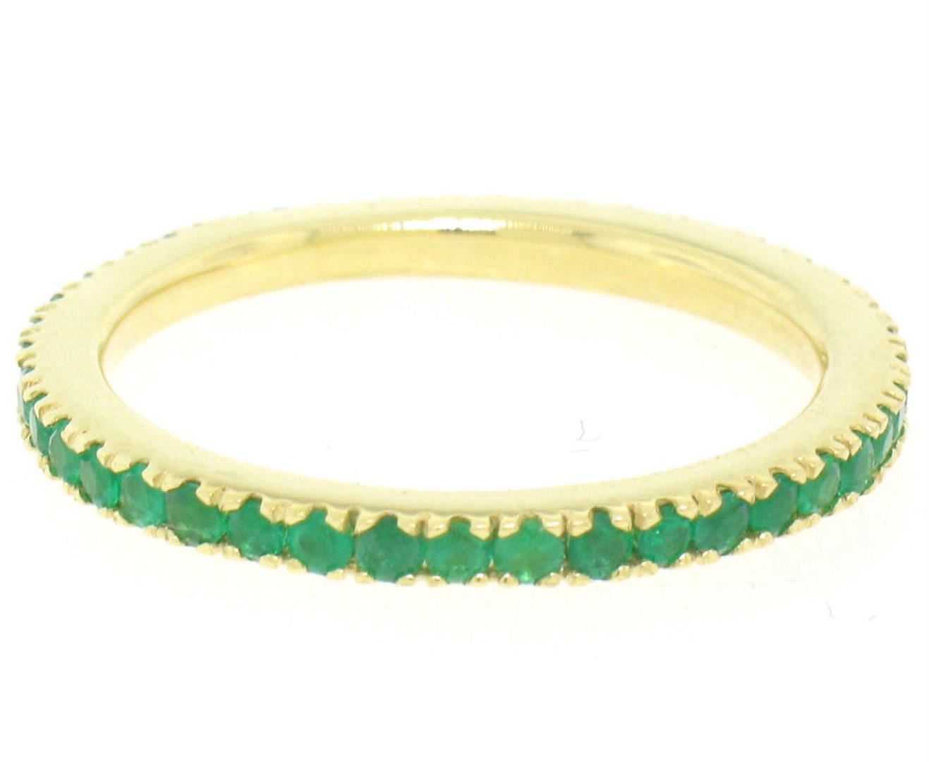 NEW 18k Yellow Gold Stackable .67ctw Rich Green Round Emerald Eternity Band Ring. Please see photos and description for all available information. A new solid 18k yellow gold stackable band ring, featuring 39 round cut natural emerlads (0.67ctw). The ring is size 7.5, weighs a total of 3.1 grams, and measures 1.80mm wide.