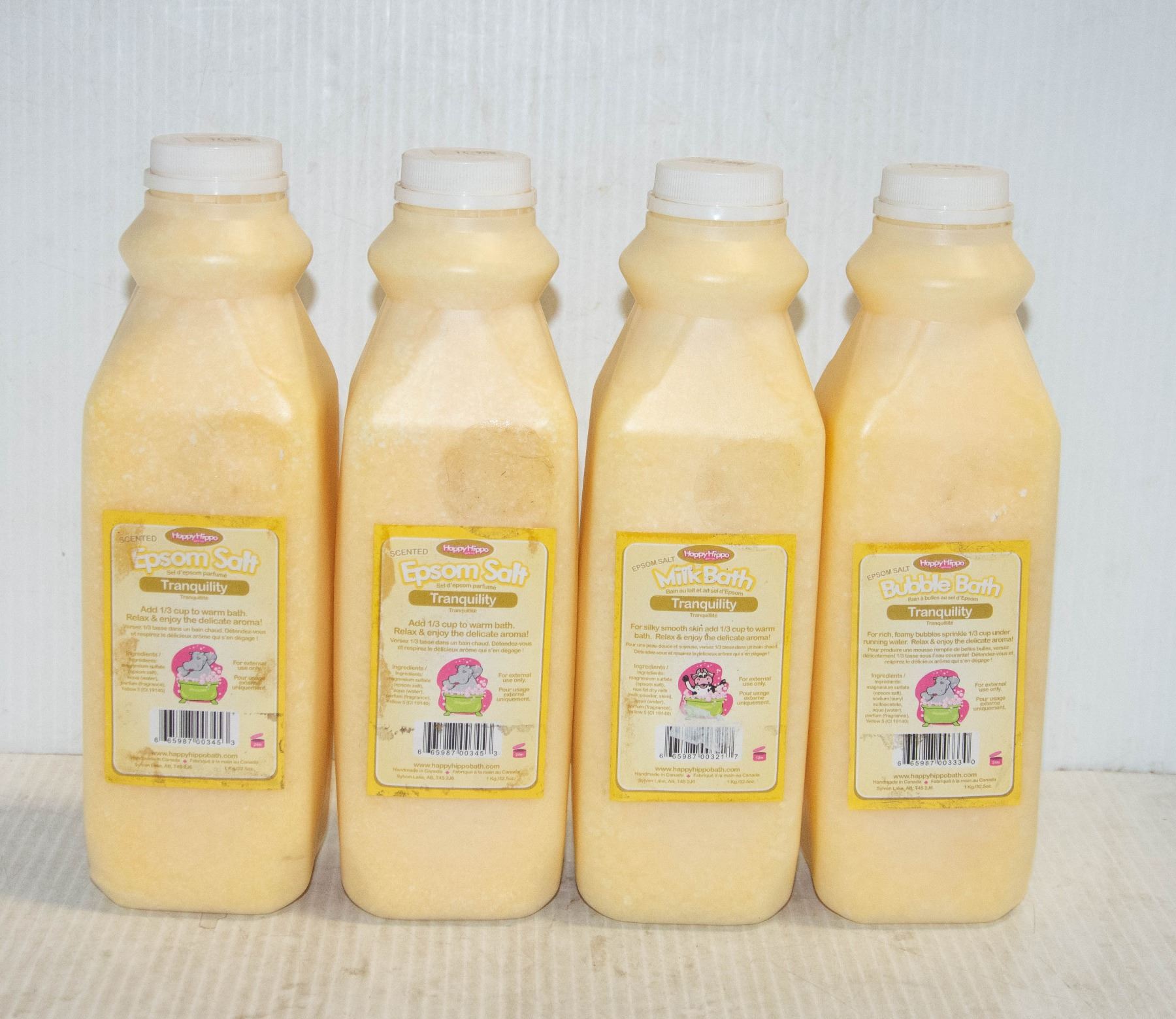 1 FLAT OF 4 1KG CONTAINERS OF HAPPY HIPPO BATH SALTS TRANQUILITY SCENT 1 MILK BATH 1 BUBBLE BATH 2 EPSOM SALTS**ALL ITEMS MUST BE REMOVED BY 5PM MONDAY, SEPTEMBER 17, 2022. ALL REMAINING ITEMS WILL BE SUBJECT TO A $6.00 PER DAY STORAGE CHARGE. ANY ITEMS REMAINING AFTER MONDAY, SEPTEMBER 17, 2022 WILL BE CONSIDERED FORFEITED. NO REFUNDS WILL BE ISSUED FOR FORFEITED ITEMS. TO SCHEDULE A PICK UP APPOINTMENT CLICK HERE