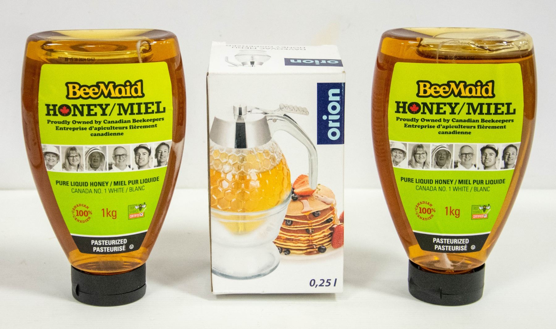 SET OF (2) 1 KG BOTTLES W/NEW ORION HONEY DISPENSER **SHIPPING NOT AVAILABLE****ALL ITEMS MUST BE REMOVED BY 5PM MONDAY, SEPTEMBER 17, 2022. ALL REMAINING ITEMS WILL BE SUBJECT TO A $6.00 PER DAY STORAGE CHARGE. ANY ITEMS REMAINING AFTER MONDAY, SEPTEMBER 17, 2022 WILL BE CONSIDERED FORFEITED. NO REFUNDS WILL BE ISSUED FOR FORFEITED ITEMS. TO SCHEDULE A PICK UP APPOINTMENT CLICK HERE