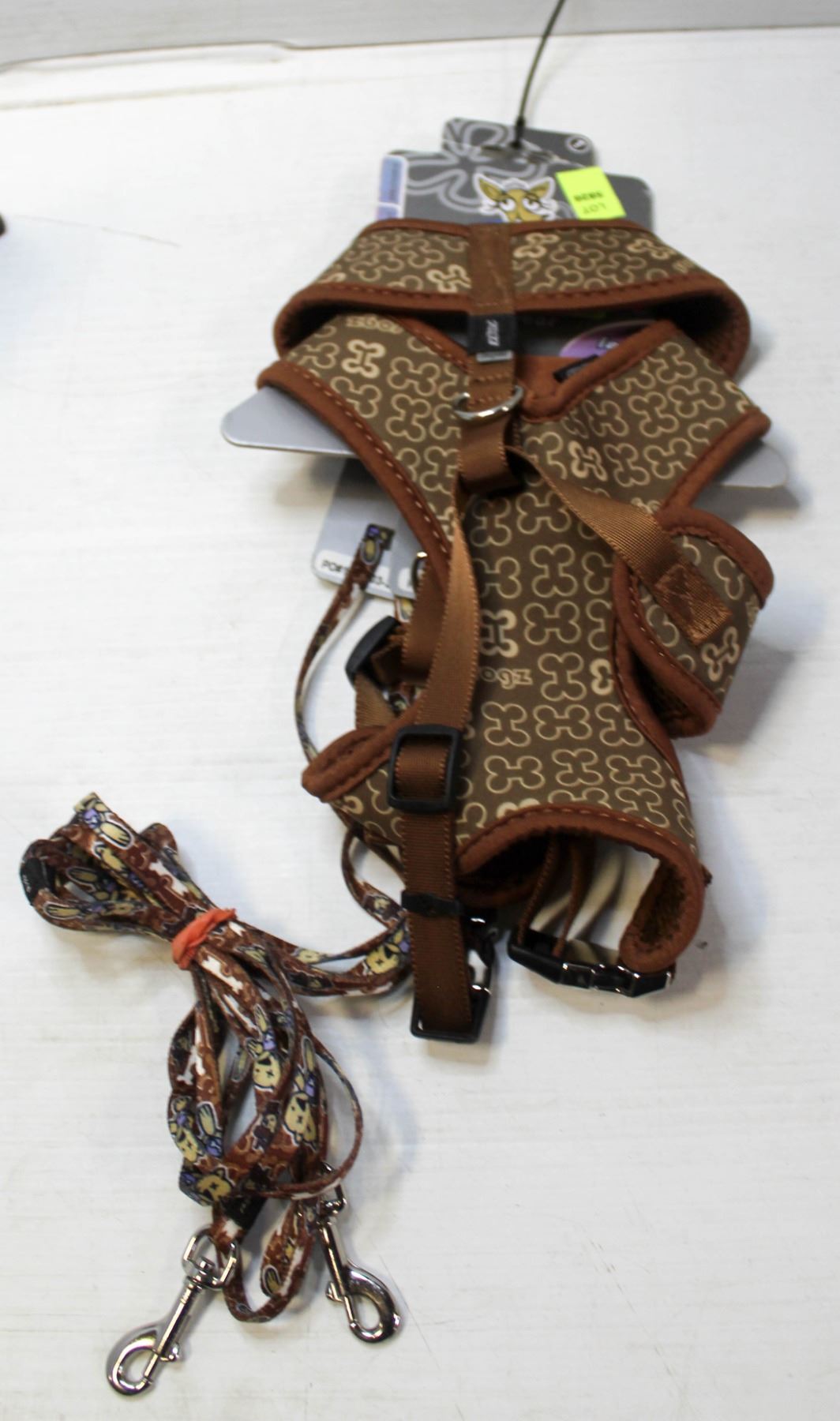 NEW 2 DOG HARNESS, 2 LEASH BROWN 16-20" CHEST