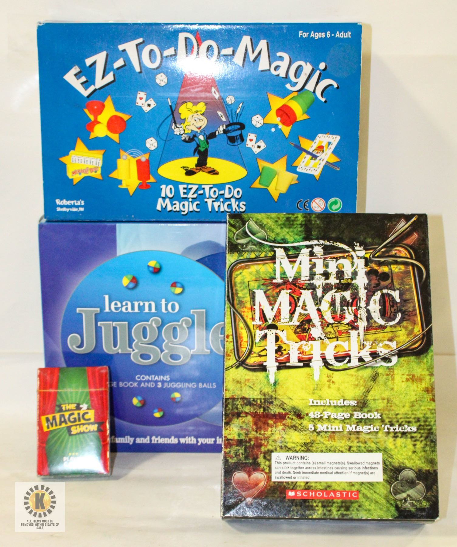 MAGIC TRICKS W/SCHOLASTIC MINI MAGIC TRICKS & SEALED MAGIC SHOW PLAYING CARDS W/LEARN TO JUGGLE (UNUSED) **ALL ITEMS MUST BE REMOVED BY 5PM SATURDAY, MARCH 29TH 2025. ALL REMAINING ITEMS WILL BE SUBJECT TO A $6.00 PER DAY STORAGE CHARGE. ANY ITEMS REMAINING AFTER MONDAY, APRIL 21ST 2025 WILL BE CONSIDERED FORFEITED. NO REFUNDS WILL BE ISSUED FOR FORFEITED ITEMS. TO SCHEDULE A PICK UP APPOINTMENT CLICK HERE