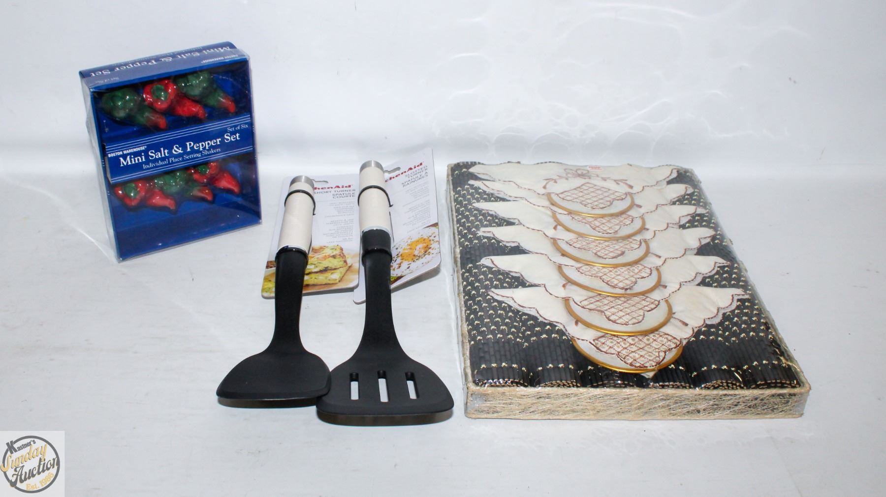 SPATULA ND SLOTTED TURNER W/NEW BOSTON WAREHOUSE MINI SALT & PEPPER SHAKERS 6 INDIVIDUAL PLACE SETTING & SEALED PLACE MAT SETTING FOR SIX BAMBOO & REUSEABLE NAPKINS **ALL ITEMS MUST BE REMOVED BY 5PM SATURDAY, SEPTEMBER 20TH 2025. ALL REMAINING ITEMS WILL BE SUBJECT TO A $6.00 PER DAY STORAGE CHARGE. ANY ITEMS REMAINING AFTER MONDAY, OCTOBER 6TH 2025 WILL BE CONSIDERED FORFEITED. NO REFUNDS WILL BE ISSUED FOR FORFEITED ITEMS. TO SCHEDULE A PICK UP APPOINTMENT CLICK HERE
