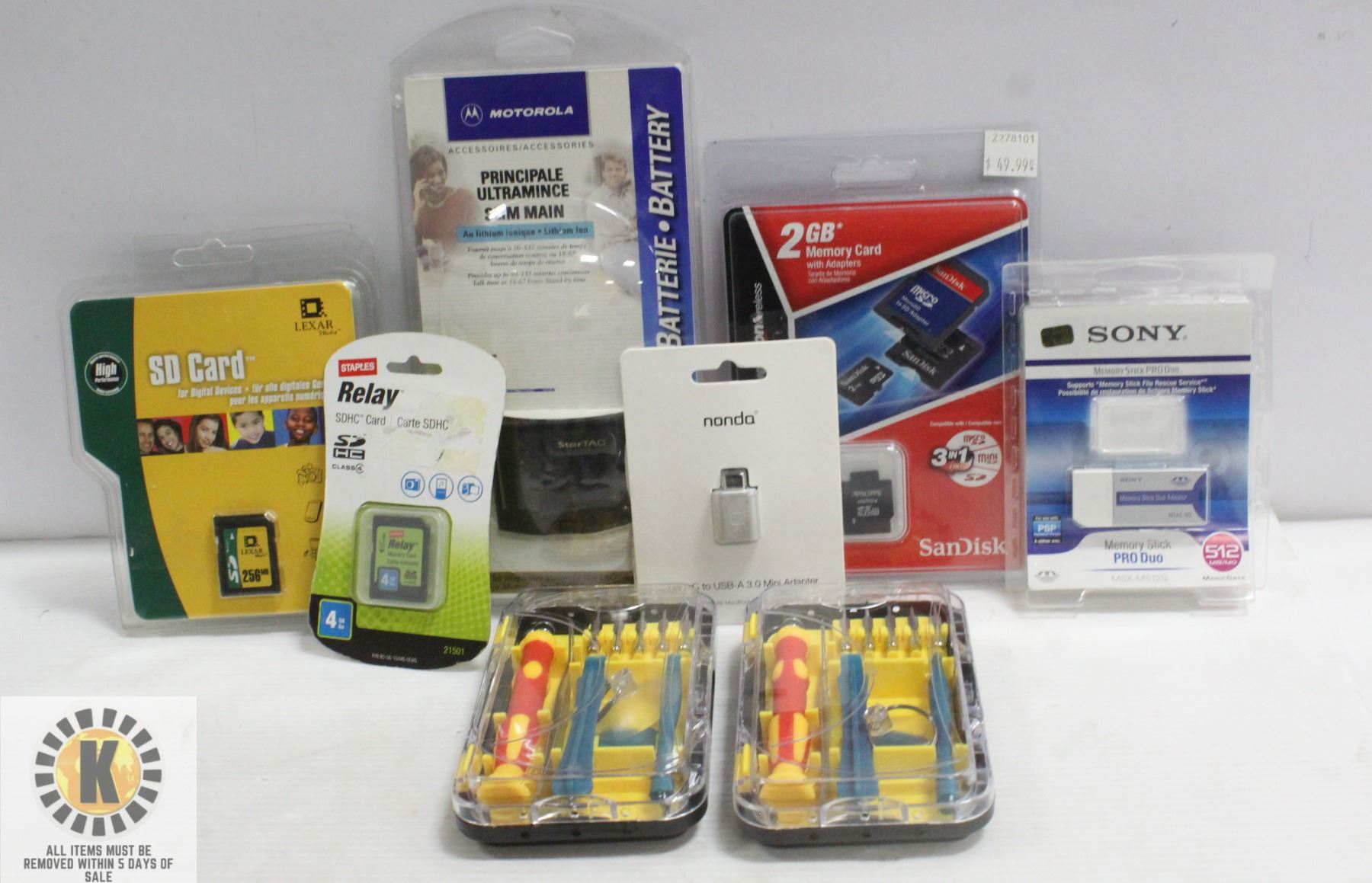 REPAIR KITS 11 PC EACH W/SEALED MEMORY CARDS LEXAR 256 MB, SANDISK 2 GB MEMORY CARD WITH ADAPTER 3 IN 1, STAPLES RELAY MICRO 4GB, MOTOROLA BATTERY, NONDA USB-C TO USB A3.0 MINI ADAPTER & SONY MEMORY STICK DUO ADAPTER #MSAA-M2 ALL ITEMS MUST BE REMOVED WITHIN 5 DAYS OF SALE