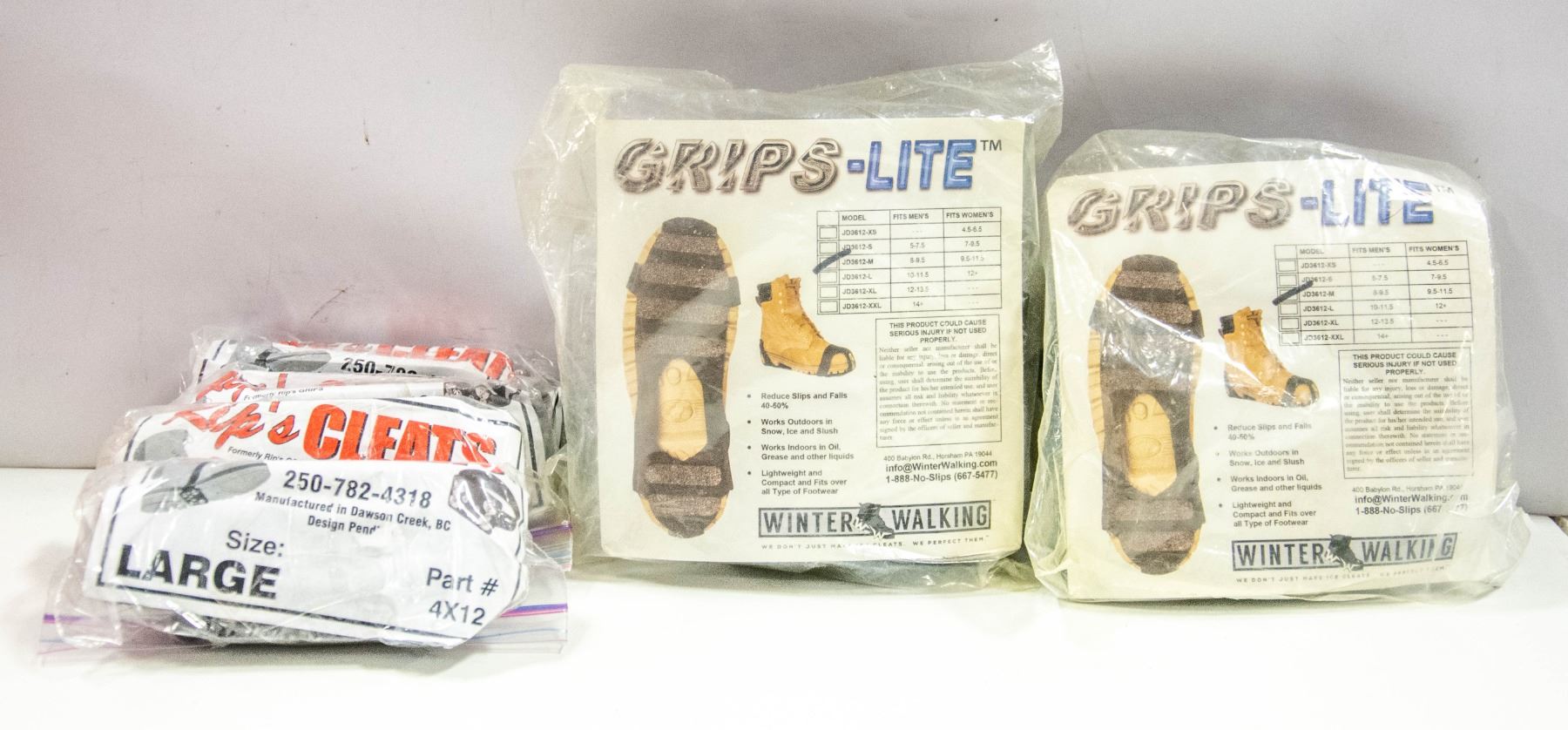 GRIPS-LITE ICE CLEATS (SEE SIZE CHART) W/RIP CLEATS (4) PAIR LARGE **ALL ITEMS MUST BE REMOVED BY 5PM SATURDAY, DECEMBER 3RD, 2022. ALL REMAINING ITEMS WILL BE SUBJECT TO A $6.00 PER DAY STORAGE CHARGE. ANY ITEMS REMAINING AFTER MONDAY, DECEMBER 18TH, 2022 WILL BE CONSIDERED FORFEITED. NO REFUNDS WILL BE ISSUED FOR FORFEITED ITEMS. TO SCHEDULE A PICK UP APPOINTMENT CLICK HERE