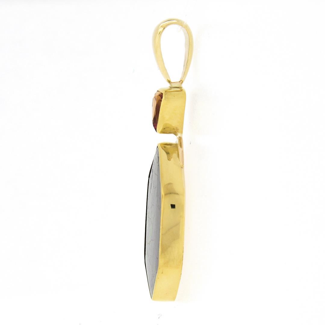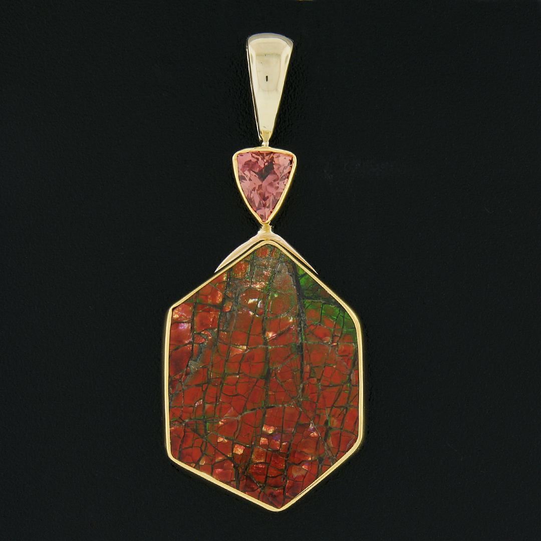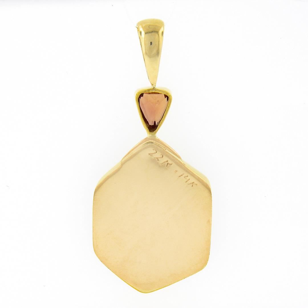 A new 22k & 14k yellow gold large pendant, with 1 hexagon cut natural ammolite (24.3x17.7mm), and 1 triangle cut natural imperial topaz (1ct). The pendant weighs a total of 6.90 grams, measures 33.60x19.20mm including the bail, and the inside of the bail measures 8.7x4.3mm.