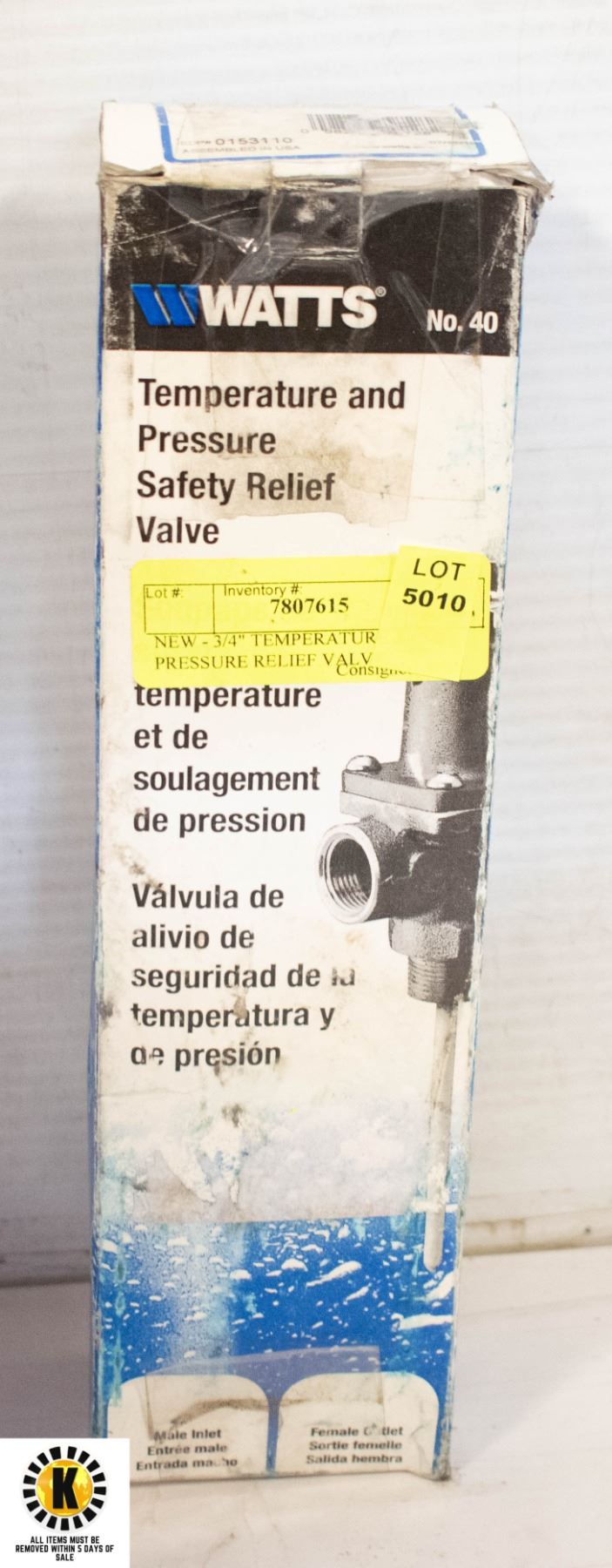 WATTS - TYPE 3/4" 40L-3-CAN125210; SAFETY RELIEF VALVE. **ALL ITEMS MUST BE REMOVED BY 5PM MONDAY, AUGUST 28TH, 2023. ALL REMAINING ITEMS WILL BE SUBJECT TO A $6.00 PER DAY STORAGE CHARGE. ANY ITEMS REMAINING AFTER MONDAY, SEPTEMBER 11TH, 2023, 2023 WILL BE CONSIDERED FORFEITED. NO REFUNDS WILL BE ISSUED FOR FORFEITED ITEMS.** TO SCHEDULE A PICK UP APPOINTMENT CLICK HERE