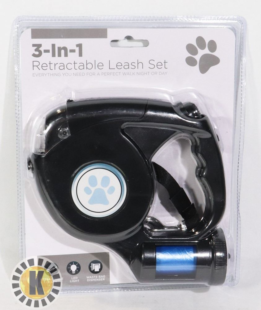 INCLUDES RETRACTABLE LEASH WITH BUILT IN LED LIGHT AND WASTE BAG DISPENSER WITH BAGS