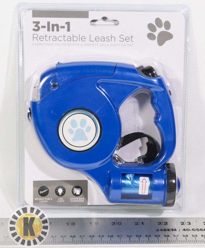 INCLUDES RETRACTABLE LEASH WITH BUILT IN LED LIGHT AND WASTE BAG DISPENSER WITH BAGS