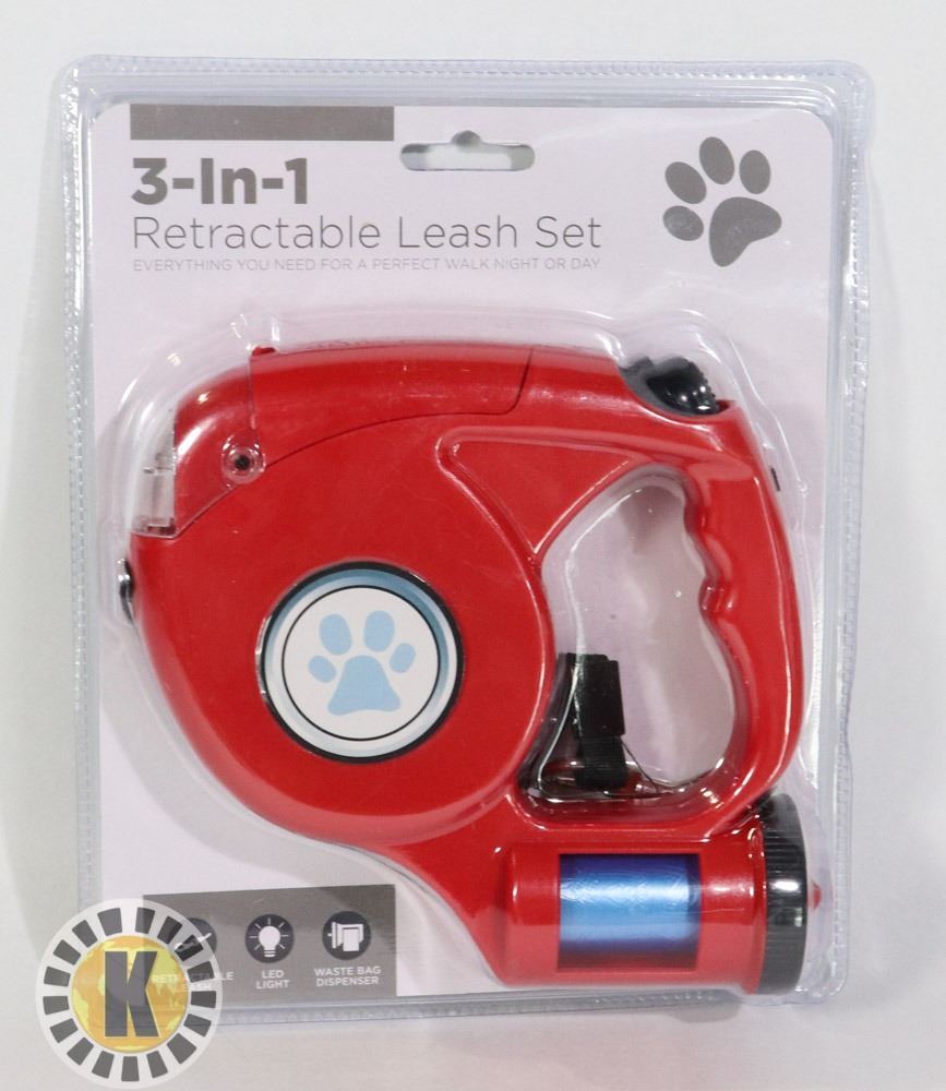 INCLUDES RETRACTABLE LEASH WITH BUILT IN LED LIGHT AND WASTE BAG DISPENSER WITH BAGS