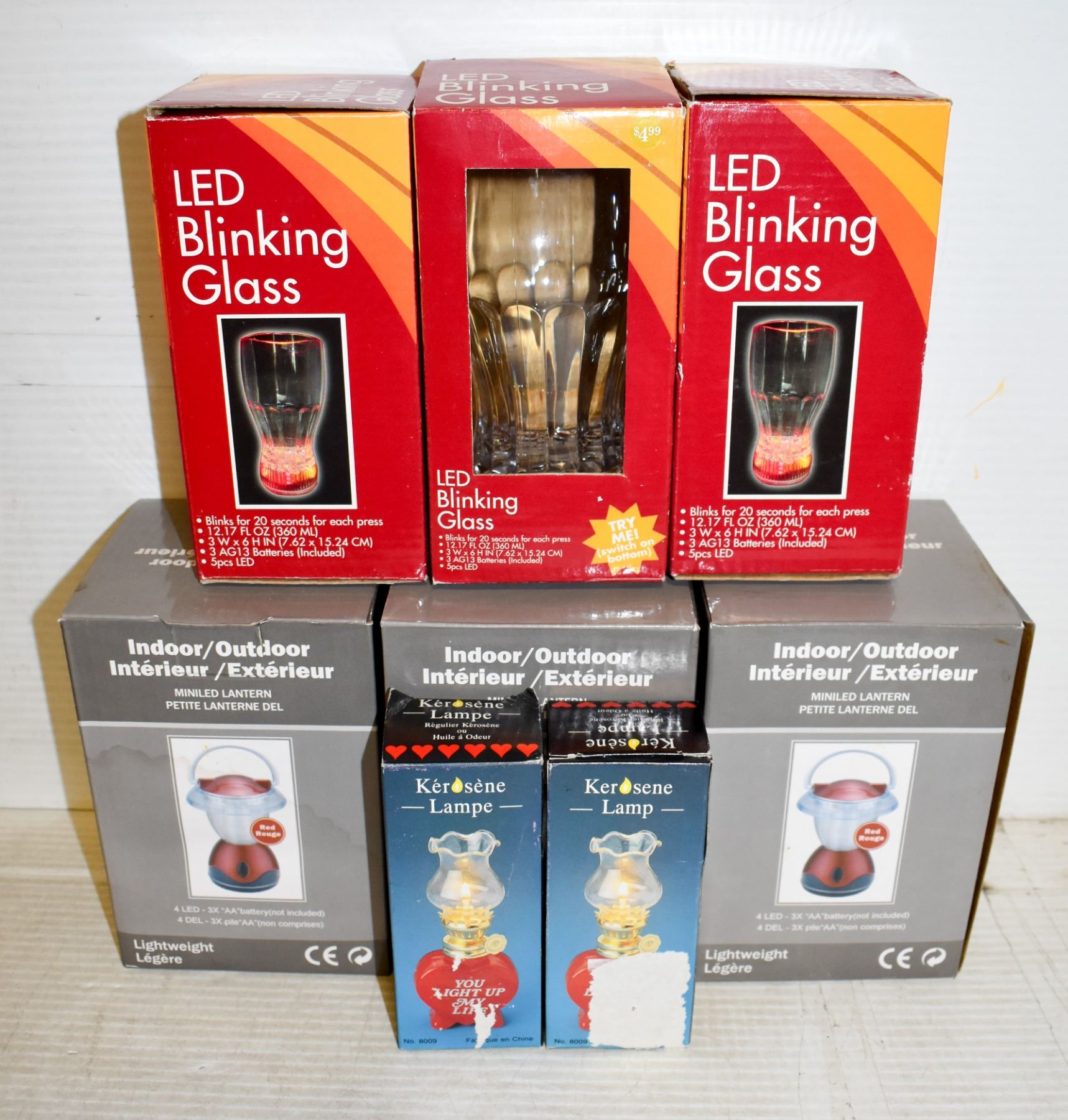 LIGHTWEIGHT LANTERNS (RED) W/NEW (3) LED BLINKING GLASS'S (PLASTIC) & 2 MINI LANTERNS