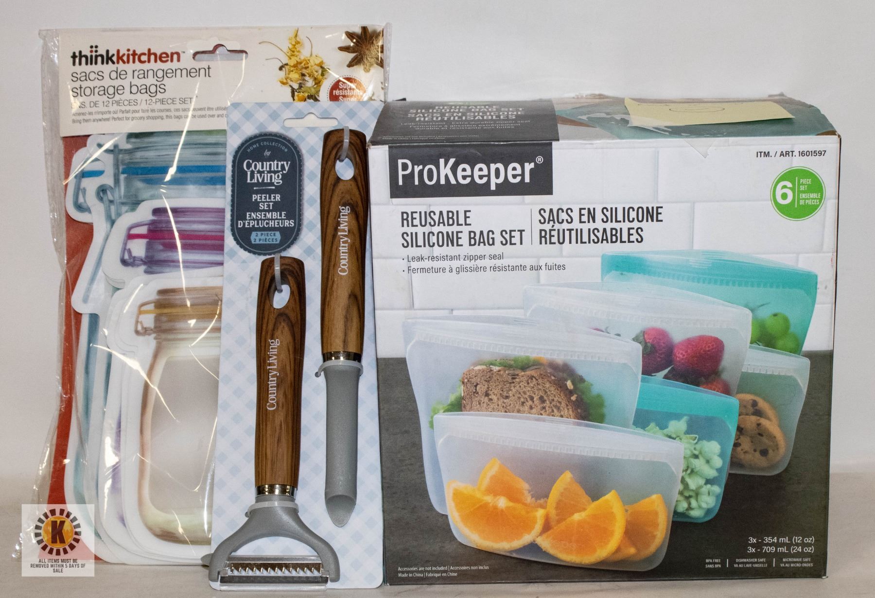 SILICONE BAG SET 6 PC W/THINKKITCHEN STORAGE BAG'S 12 PC & COUNTRY LIVING 2 PC PEELER SET **ALL ITEMS MUST BE REMOVED BY 5PM SATURDAY, APRIL 26TH 2025. ALL REMAINING ITEMS WILL BE SUBJECT TO A $6.00 PER DAY STORAGE CHARGE. ANY ITEMS REMAINING AFTER MONDAY, MAY 12TH 2025 WILL BE CONSIDERED FORFEITED. NO REFUNDS WILL BE ISSUED FOR FORFEITED ITEMS. TO SCHEDULE A PICK UP APPOINTMENT CLICK HERE