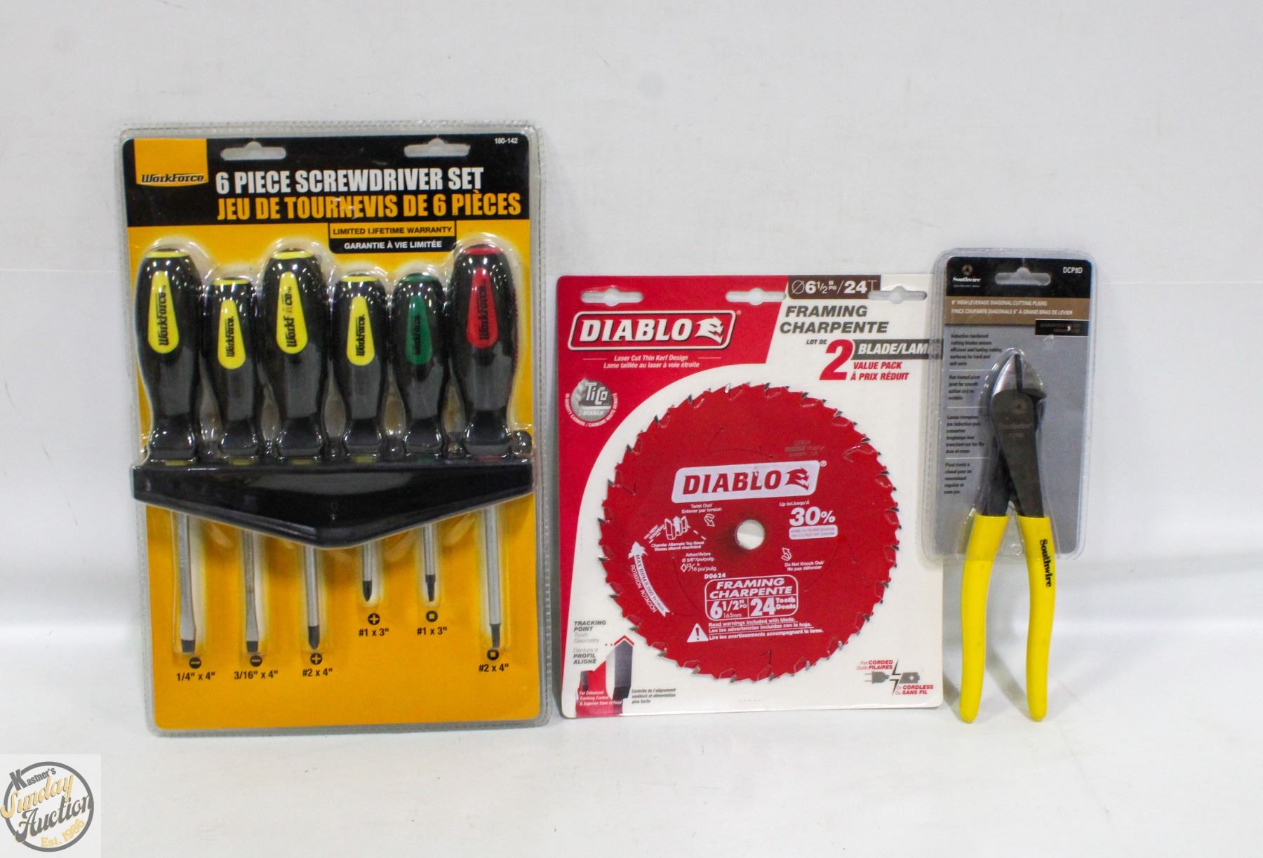 SCREWDRIVER SET W/DIABLO SAW BLADES 2-PK & WORKFORCE 6 PC SCREW DRIVER SET **ALL ITEMS MUST BE REMOVED BY 5PM SATURDAY, NOVEMBER 29TH 2025. ALL REMAINING ITEMS WILL BE SUBJECT TO A $6.00 PER DAY STORAGE CHARGE. ANY ITEMS REMAINING AFTER MONDAY, DECEMBER 15TH 2025 WILL BE CONSIDERED FORFEITED. NO REFUNDS WILL BE ISSUED FOR FORFEITED ITEMS. TO SCHEDULE A PICK UP APPOINTMENT CLICK HERE