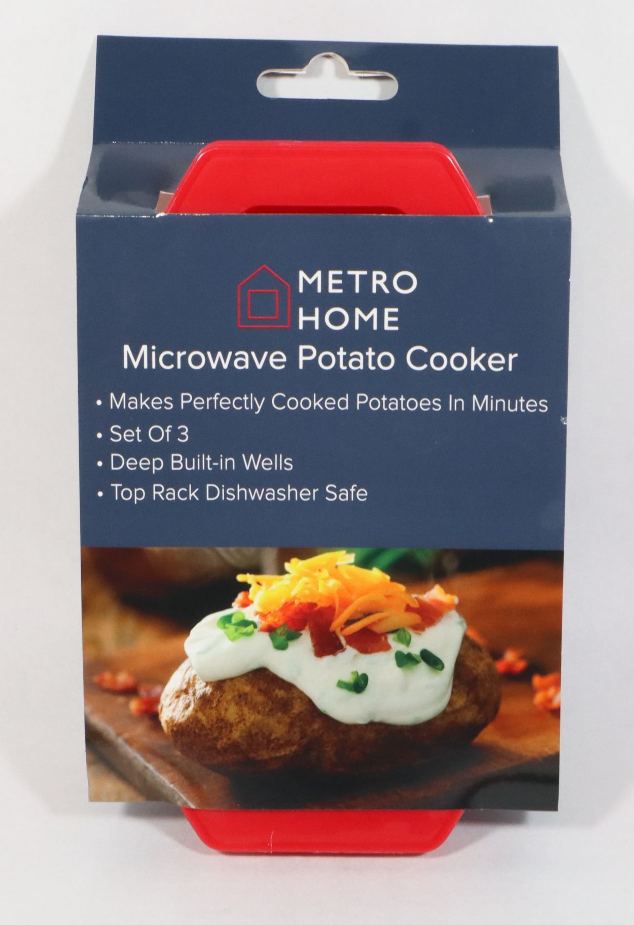 TOP RACK DISHWASHER SAFE. MAKES PERFECTLY COOKED POTATOES IN MINUTES. INSTRUCTIONS FOR USE ON BACK