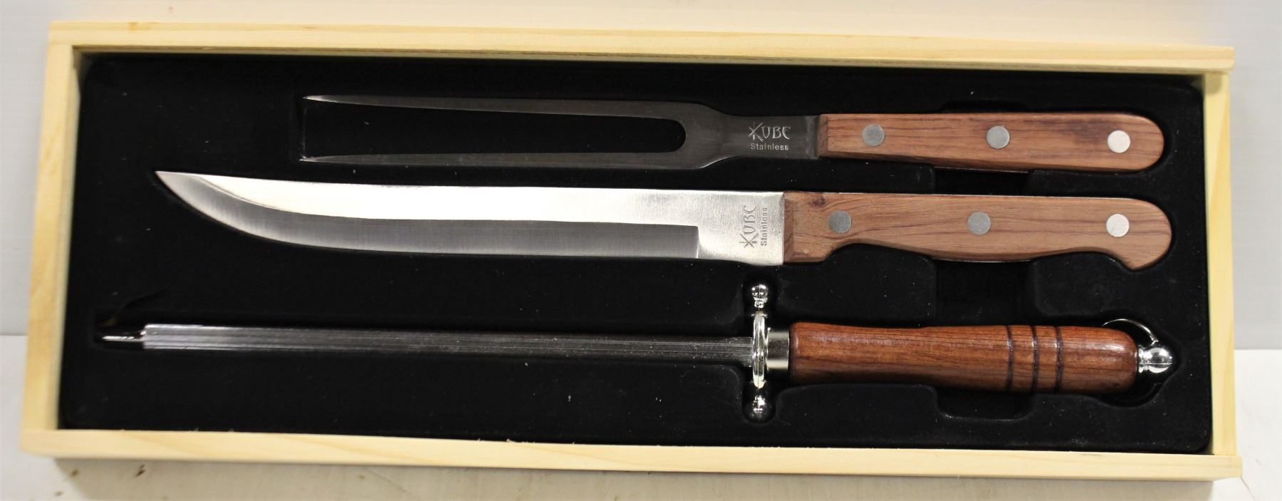 7.5" CARVING KNIFE, 6-1/4" FORK, & 8" STEEL, ALL WITH WOOD HANDLES (BOTH KNIFE AND FORK ARE FULL TANG)