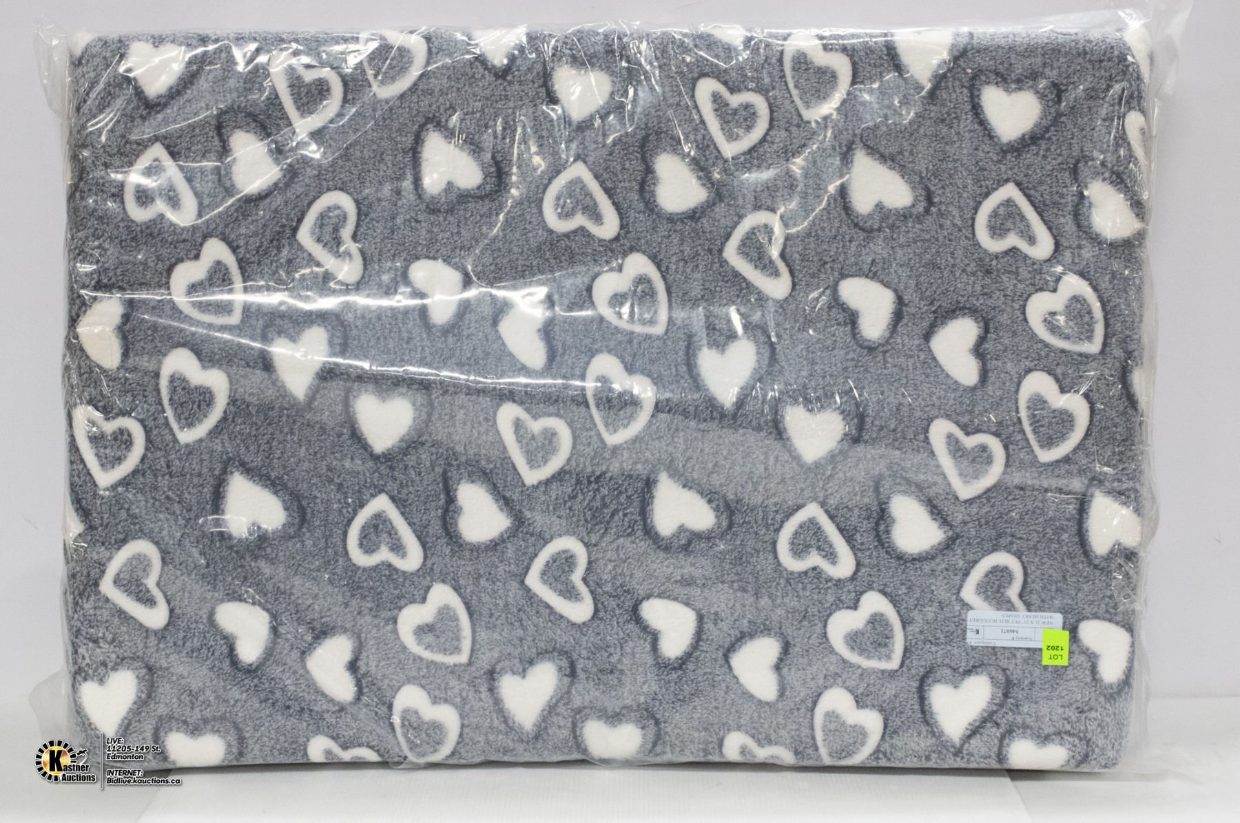 NEW 31 X 21" PET BED, BLUE/GREY WITH HEART SHAPES