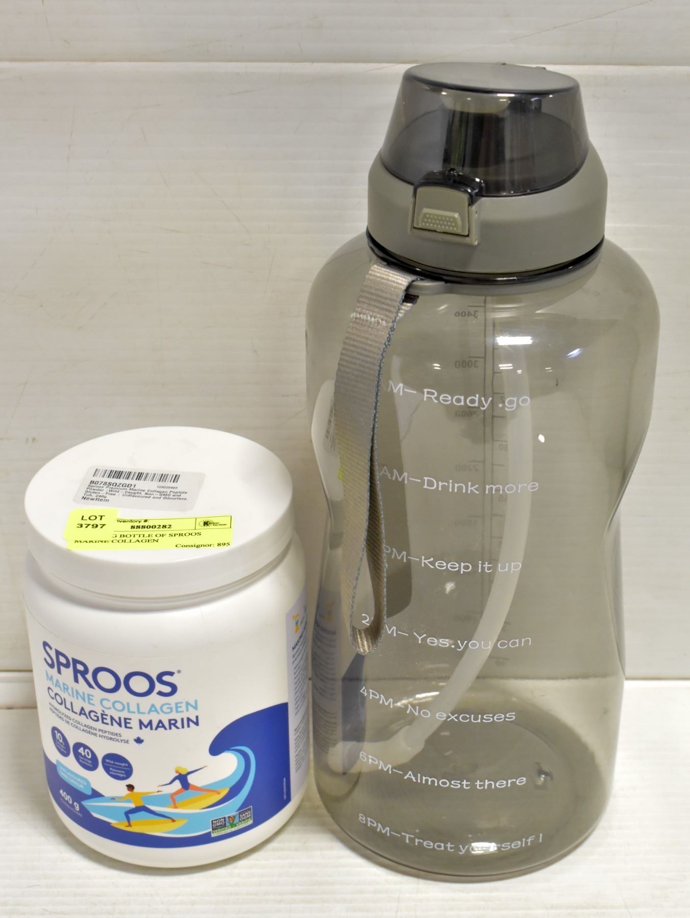 AND NEW 128OZ WATER BOTTLE, CLEAR GREY, WITH POP UP LID - HYDROLYZED COLLAGEN PEPTIDES, POWDER, NON GMO AND GLUTEN-FREE, UNFLAVOURED AND ODOURLESS, 40 SERVINGS