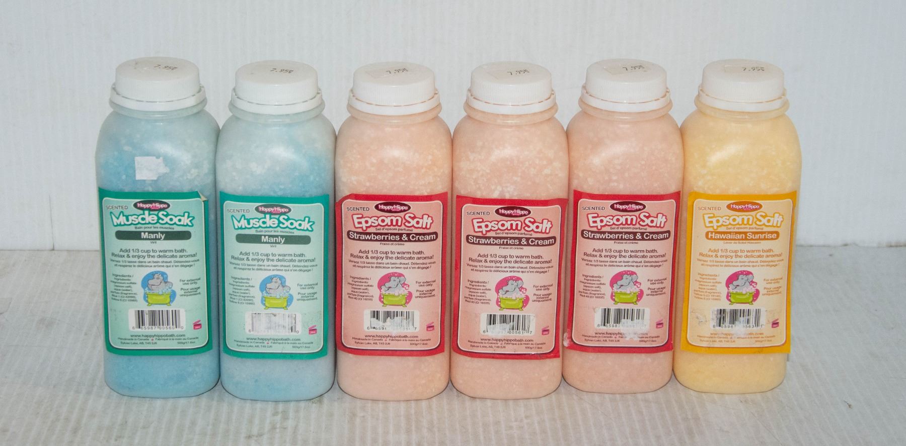 1 FLAT OF 6 500 GRAM HAPPY HIPPO BATH SALTS IN SCENTS OF 2 MANLY MUSCLE SOAK 3 STRAWBERRIES AND CREAM 1 HAWAIIAN SUNRISE**ALL ITEMS MUST BE REMOVED BY 5PM MONDAY, SEPTEMBER 17, 2022. ALL REMAINING ITEMS WILL BE SUBJECT TO A $6.00 PER DAY STORAGE CHARGE. ANY ITEMS REMAINING AFTER MONDAY, SEPTEMBER 17, 2022 WILL BE CONSIDERED FORFEITED. NO REFUNDS WILL BE ISSUED FOR FORFEITED ITEMS. TO SCHEDULE A PICK UP APPOINTMENT CLICK HERE