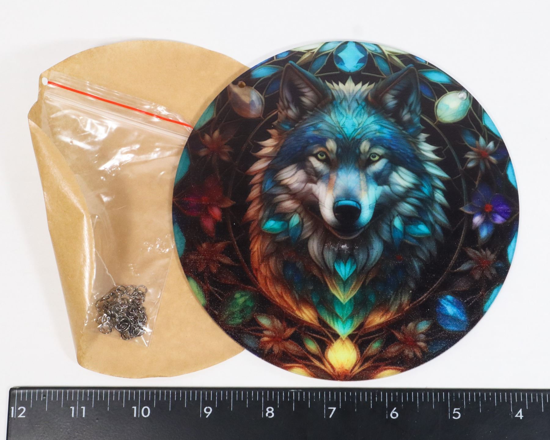 WITH CHAIN FOR HANGING. PROTECTIVE STICKER ON ONE SIDE THAT MUST BE REMOVED FOR FULL EFFECT