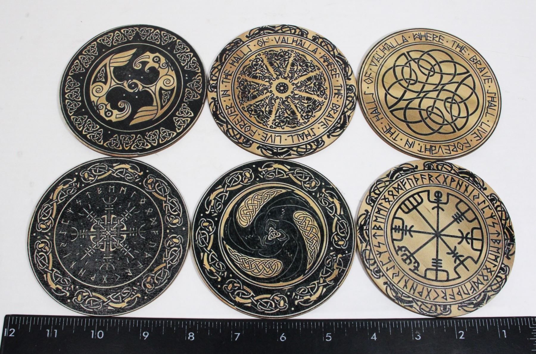 NEW 6PC NORSE VIKING THEME WOOD COASTER SET