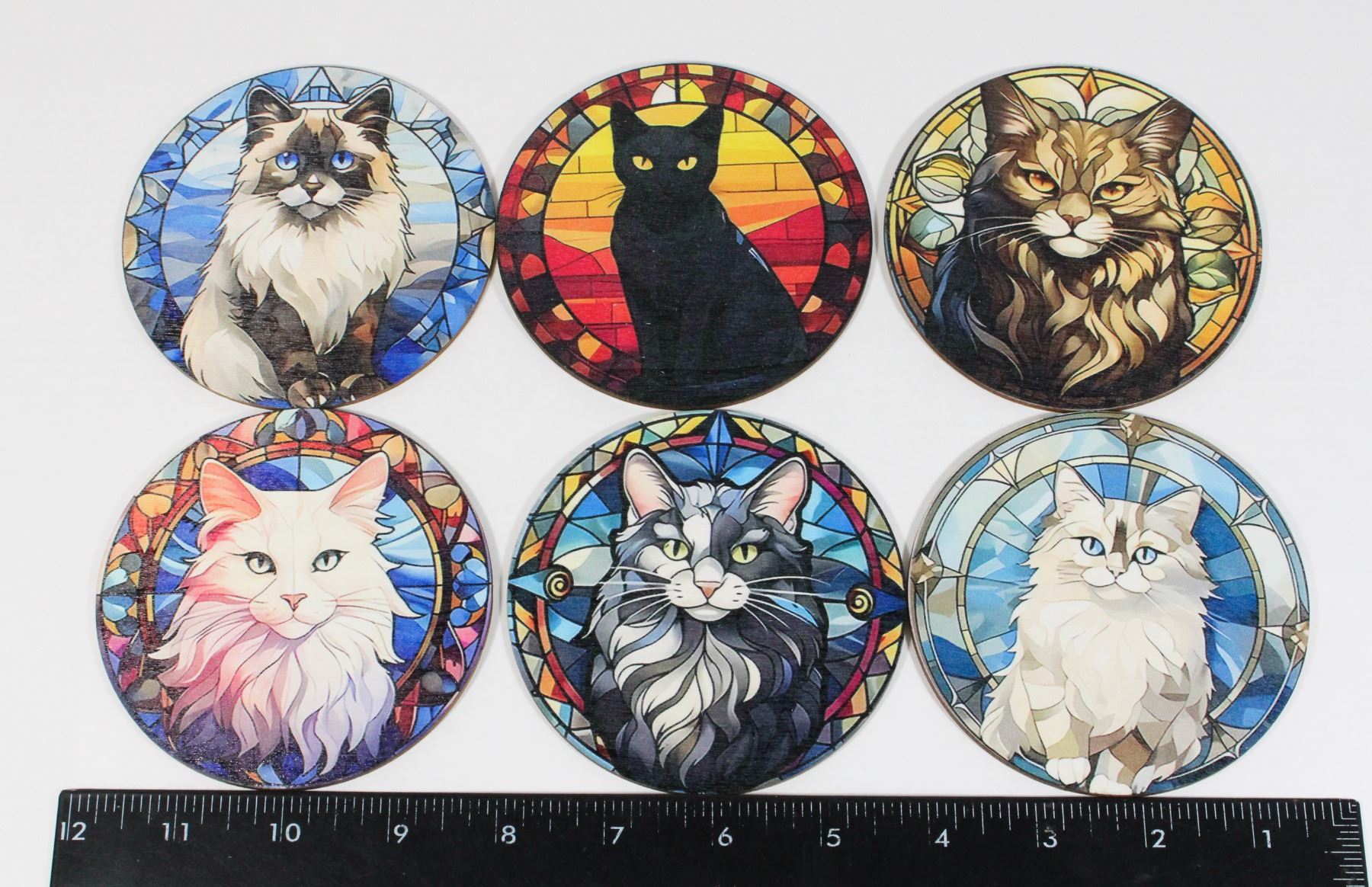 NEW 6PC STAINED GLASS CAT THEME WOOD COASTER SET