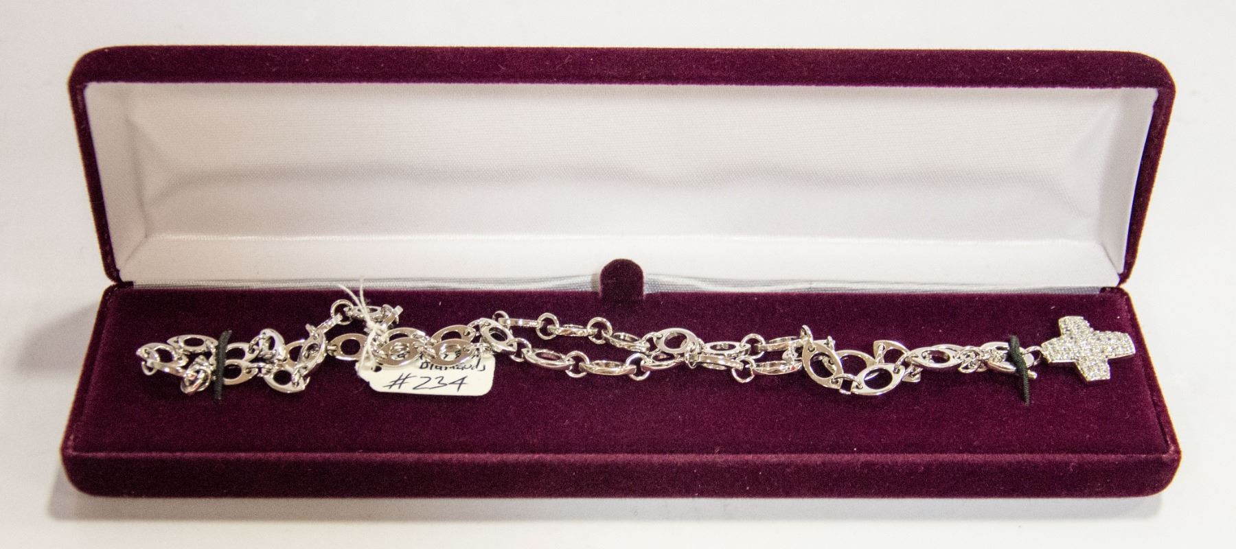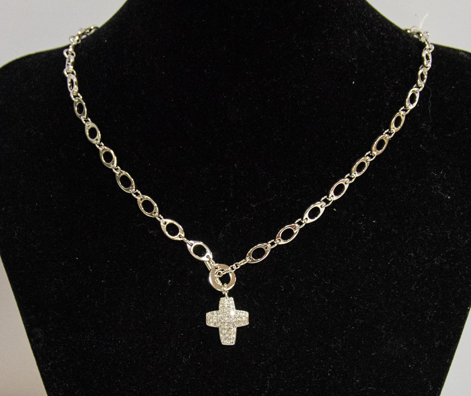 NEW .925 STERLING SILVER NECKLACE CROSS, WITH 2.10CTW CUBIC ZIRCONIA STONES, 18" LENGTH, TOTAL WEIGHT 22.40 GRAMS, VELVET BERGUNDY CASE