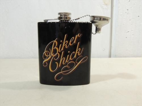 NEW ALL METAL "BIKER GIRL" WISKEY FLASK. AS SHOWN. VIEW PICTURE FOR DETAIL.