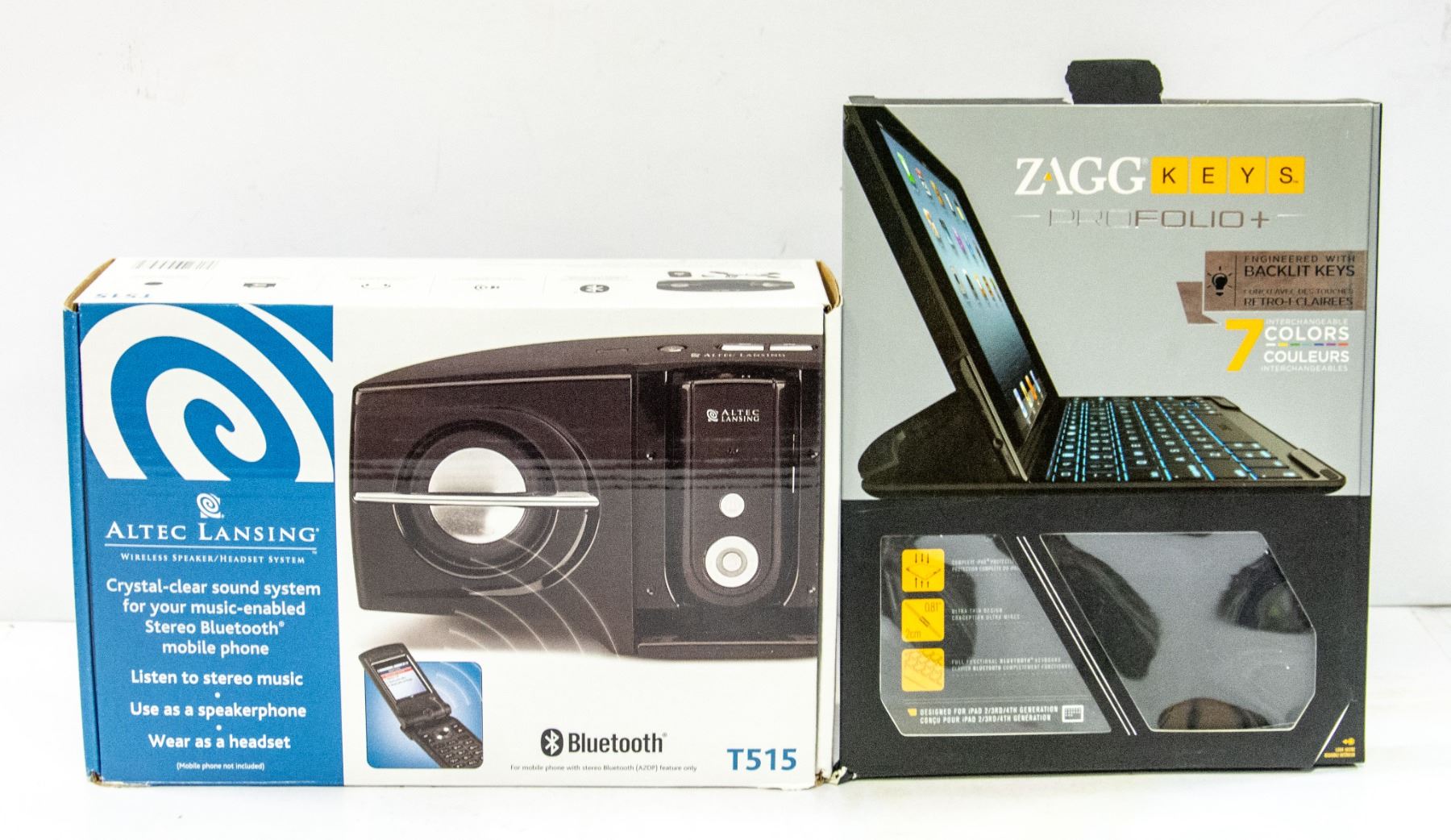 BLUETOOTH PORTABLE SPEAKER/HEADSET SYSTEM W/ZAGG KEYS PORTFOLIO KEYBOARD FOR 2/3RD/4TH GENERATION (NEW OPEN BOX)
