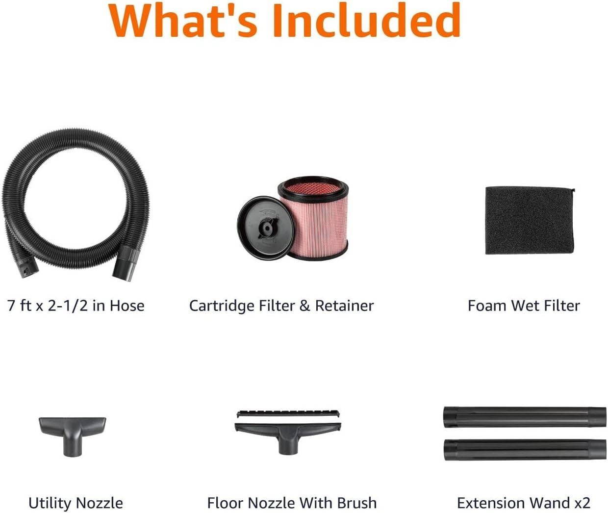 -ACCESSORIES INCLUDE A REUSABLE FOAM WET FILTER, CARTRIDGE FILTER, AIR AND NOISE DIFFUSER, AND HOSE (7’ X 2-1/2” DIA)