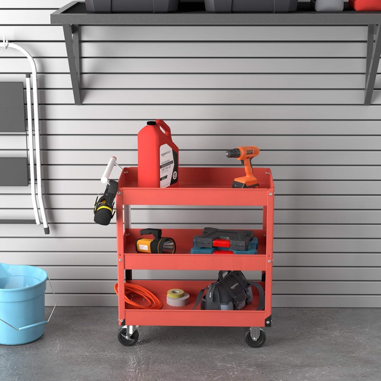 EASILY TRANSPORT YOUR TOOLS, EQUIPMENT, SUPPLIES, AND MORE WITH THIS AMAZON BASICS UTILITY/SUPPLY CART. THIS VERSATILE CART IS USEFUL IN ALMOST ANY SETTING, FROM THE KITCHEN AT HOME TO AN OFFICE, WAREHOUSE, GARAGE, OR SHOP.