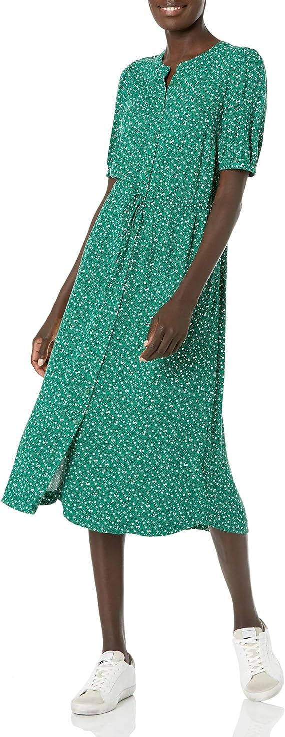 WAISTED MIDI A-LINE DRESS IN GREEN VINE / LEAF PRINT